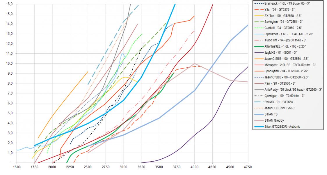 The new GTX2863R turbo is in place - and has been for a while now... Sofar I am running more or less on my old map, so it's far from optimal but things are certainly working much better than before!! I now have full boost (18psi for now) at 3800 which is 1500rpm sooner than the old Turbonetics thing. Also no more oilsmoke and noises. However, I am wondering why my boost curve rises so slowly from 1750 to 3000? Especially compared to the Cueball's 2860-setup, which seems quite similar to the hardware I'm running... Could it be cam's that needs less overlap?