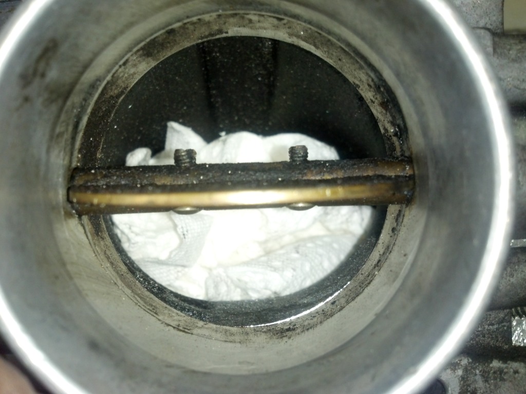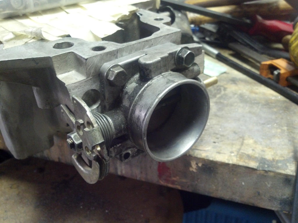 Instead of using a miata throttle body I decided to use one from a volvo. The 16v 740 series has a fairly slim throttle body. The same throttle body should be on a volvo 850 turbo too. The Throttle body lines up perfectly with the holes I drilled out and is exactly the same size as the inlet.