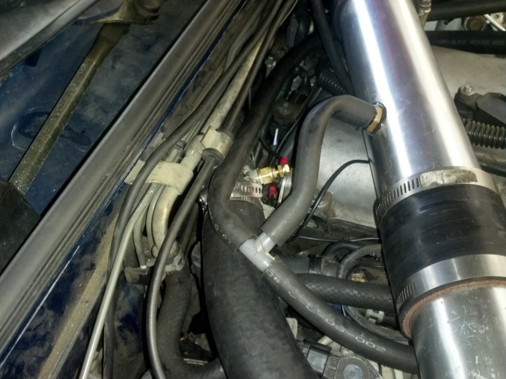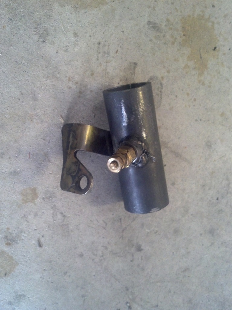 I needed to cut the hose and join it with a 90 degree turn to go down to the waterneck on the back of the head. I made this pipe with both a mounting tab and a bung for my coolant gauge to do so.