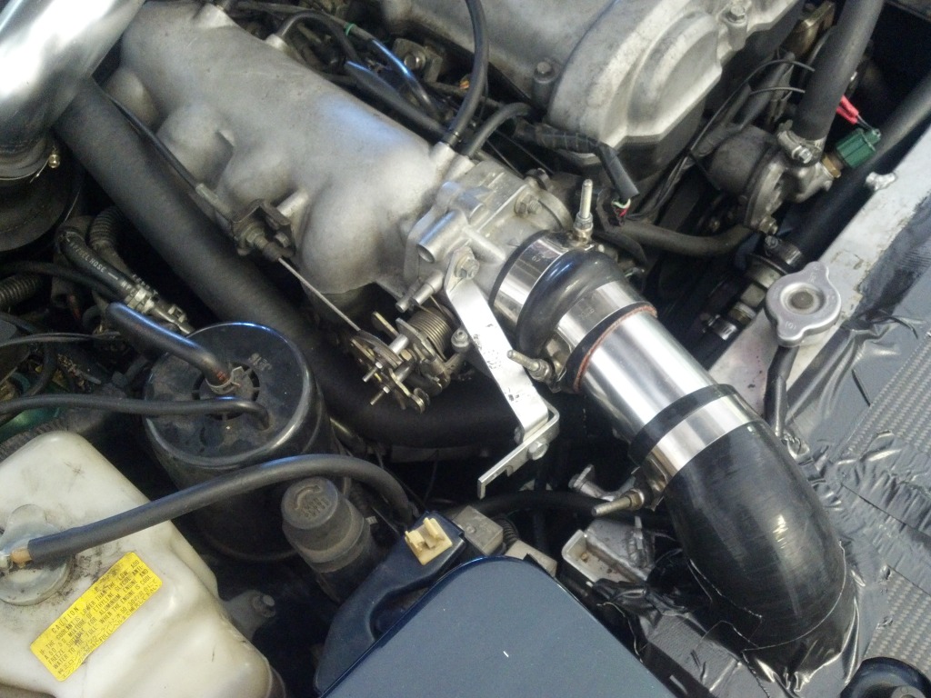 I tried the car at adams kart track and the throttle was super sensitive making the car impossible to drive. There was no difference between partial throttle and full throttle. Been working on a dual throttle body setup in hopes of fixing that. I mated a volvo 960 3" throttle body to a maf adapter and placed it above the valve cover. Funny thing is this was built with parts I had laying around lol. Car is much more drivable now and it quieted the blower down. Also eliminated the surge the car had on shifts.