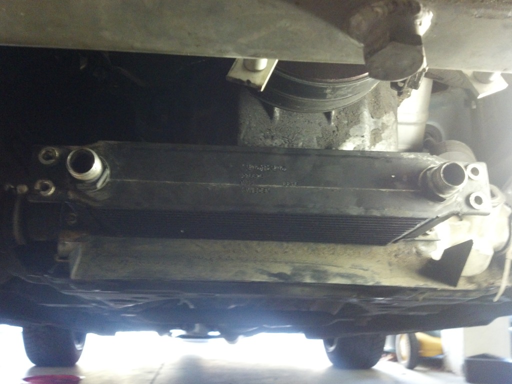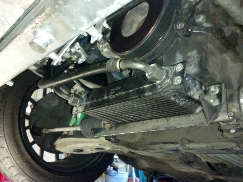I finally decided to put an oil cooler in the car. Something it desperately needed. I used a volvo cooler with a cooltek thermostat and mated it to the oil filter relocator I had on the car. There was no space in the mouth of the car so I had place it on the steering rack.