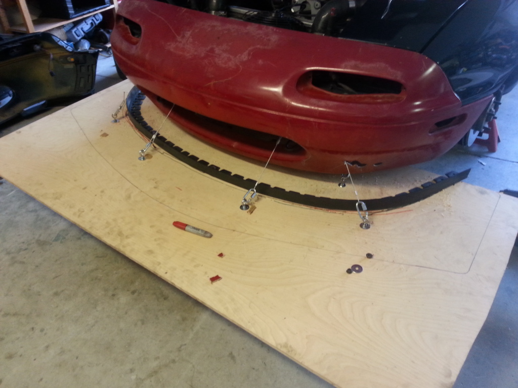 Some work on the front aero to match the rear. The design is similar to the one I helped Sonny build on his msm except this one is completly suspended by cables. I found that if I ran a cable from far back all the way to the front of the bumper, (3rd pic) it pretty much eliminates any rotation of the splitter. It is pretty stable, supports my weight and quick to remove. Also I left a gap between the bottom of the airdam and the splitter which is filled by the garden edging. Still need to clean up the cut but the benifit is this allows it to flex upward a decent amount.