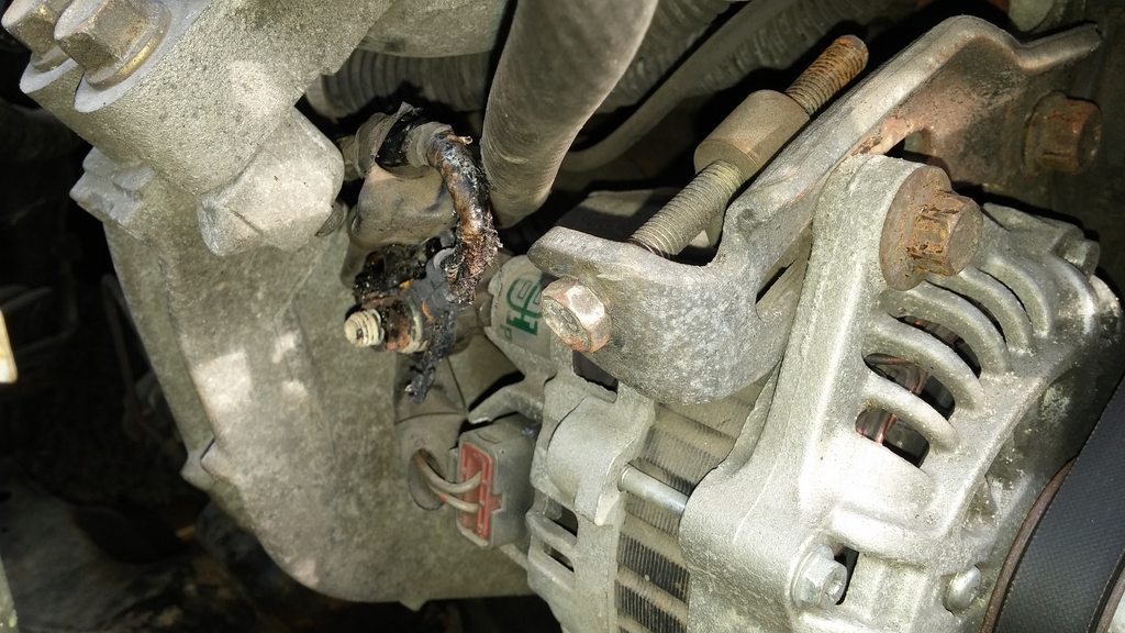 I was sitting in traffic yesterday and started to smell something foul. I pulled over and popped the hood. I saw a small whiff of smoke and turns out that the nut that holds the battery cable to the alternator had worked it's way off and had a reaaally small contact area, which meant that it was glowing from heat. and had managed to melt the insulation of the cable.