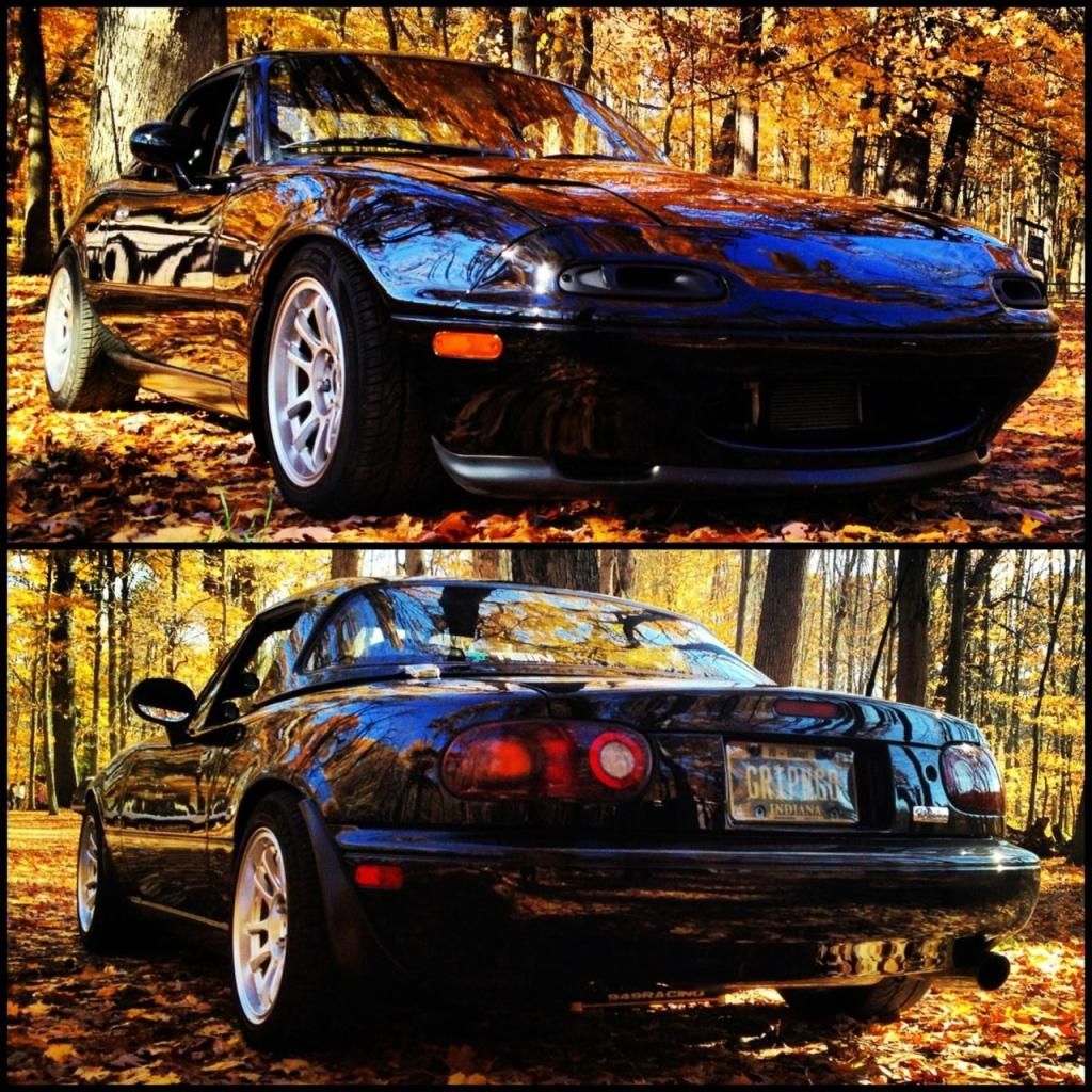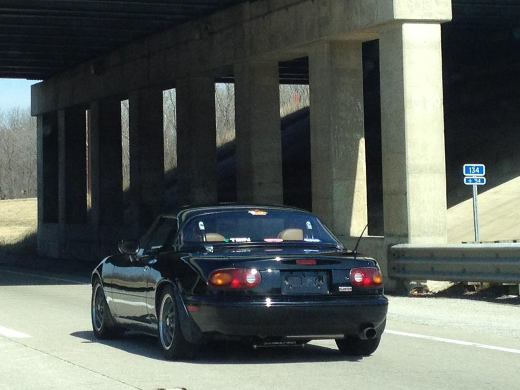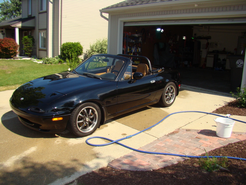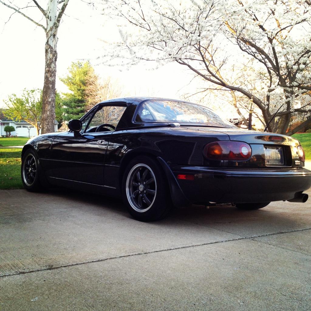 I think the ride height is perfect, and the stance isn't stretch and poke but it isn't passive. It probably looks just like a lot of the other black Miatas with the same wheels, but in my area it's the only one.