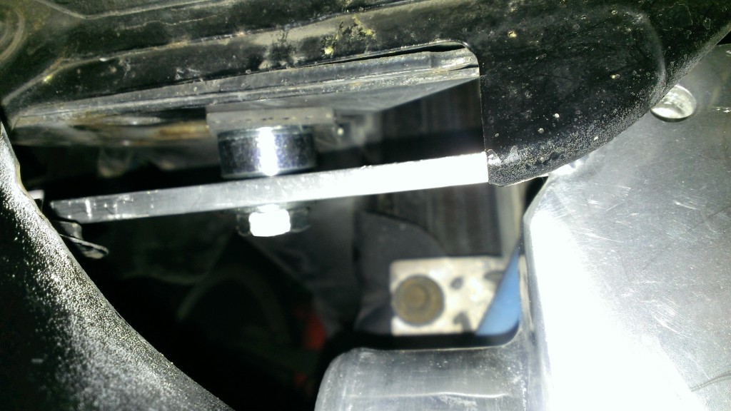 First thing I noticed was that I was missing the tow hooks. Quick research showed that the threaded holes would accept a 10mm 1.25 pitch bolt. I took some measurements and went to the hardware store. I had about a half inch gap between my mounting tabs and the frame of the car where the tow hooks once were. I fixed this problem by a small sleeve, a washer, and a cut of heater hose to give it some vibration dampening.