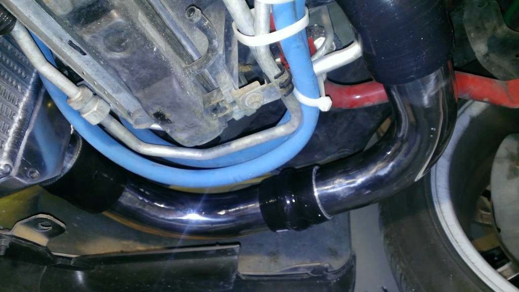 The 90 off the core has to be shortened about 2in, to allow the tire enough clearance to move without hitting the piping.