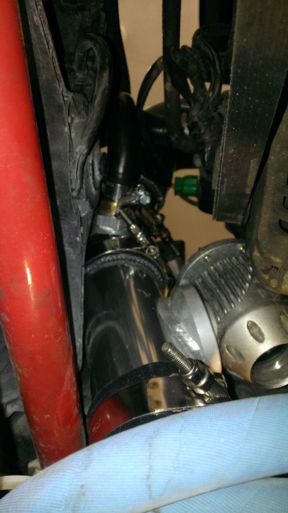 You can just barely see where I clearanced the plastic support of the fan nearest the TB to allow room for the 90 silicone elbow. I may get a set of slim fans, and if I do that I'll just get an upgraded radiator.
