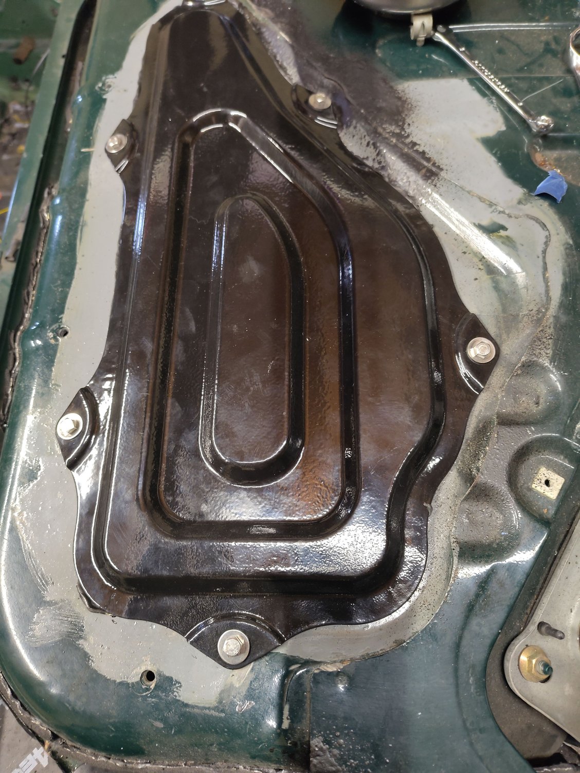 Fuel filter lid is done, powdercoated, and converted from the damn screws. Been on a slow crusade of removing all the screws possible on this car and replacing them with bolts, to me, this is highly satisfactory. I wish I could swap out the screws holding the fuel pump assembly in, but I don't think that's possible.
