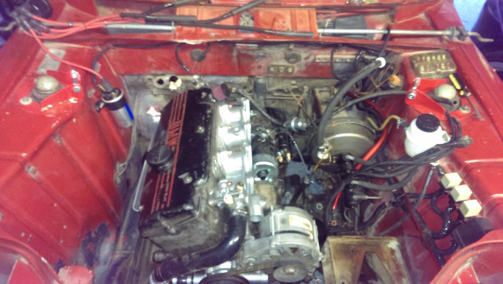 I also pulled the A/C compressor which weighed about 15 pounds. I wanted to cut out the battery tray and clean up the engine bay a bit more, but I just ran out of time yesterday. I had to get the engine back in so I could close the garage, and I had gf obligations last night so I couldn't work really late. The engine is in, but I need to drill the holes for the new transmission mount. Lots of work left before she is running, I probably need another whole day, but not sure when that will happen.