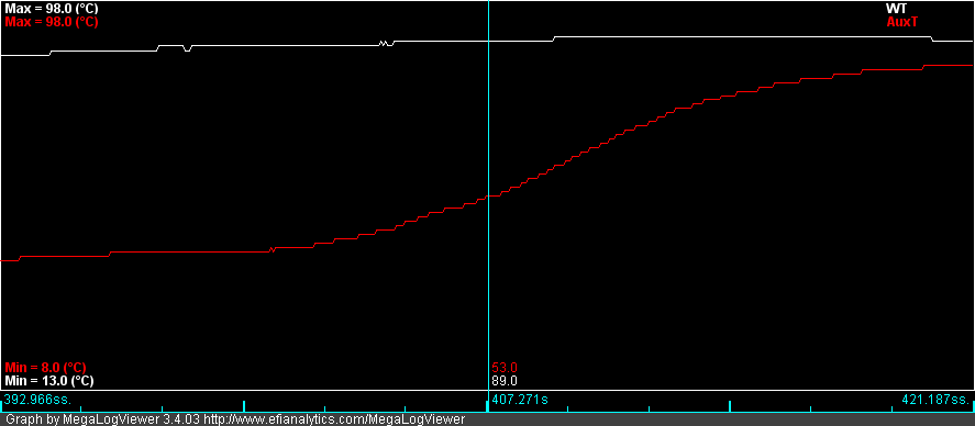 I've added a thermistor to the front of the head so I can compare temps between the front/back. Another bonus is being able to see the thermostat open, it looks pretty cool on a graph: