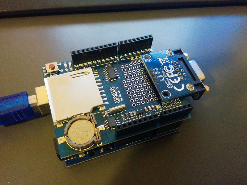 The second project I have been working on is an Adaptronic hardware datalogger. This runs on AVR (Arduino) using a fairly common shield, plus an RS232 line driver board: