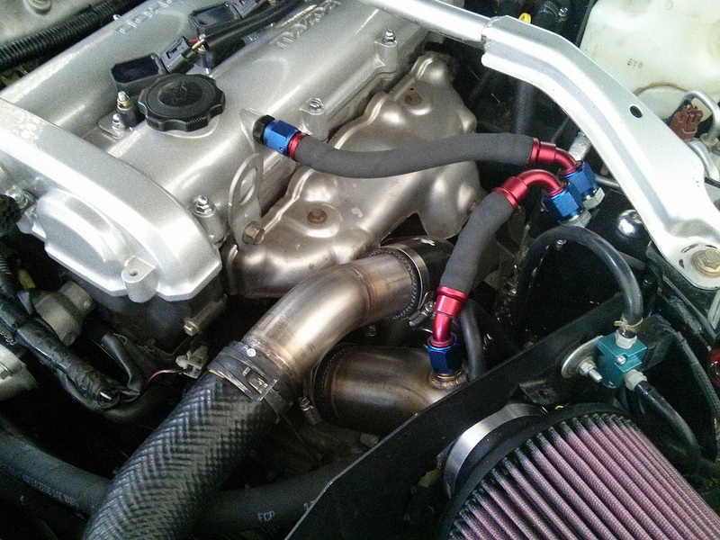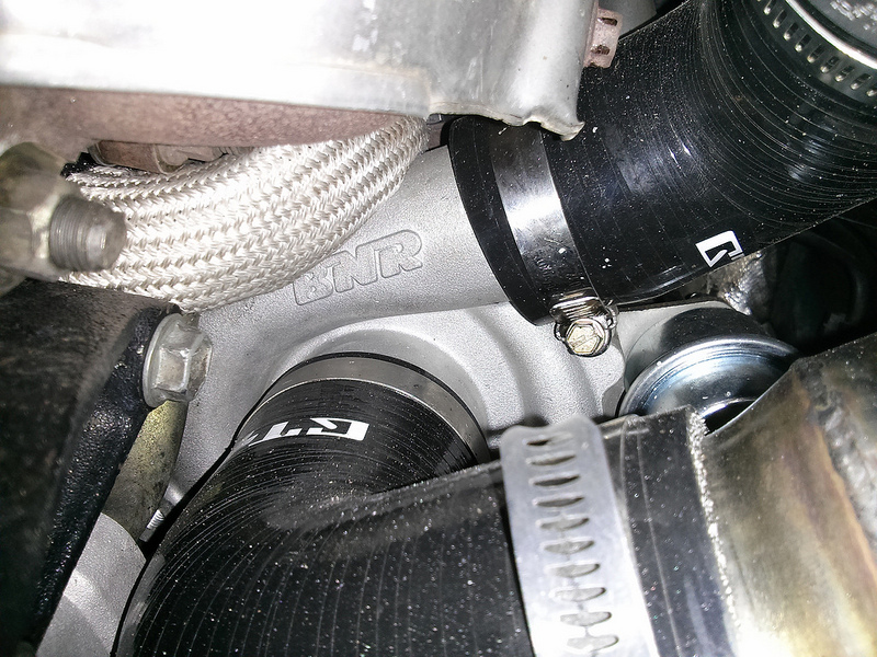 Space is pretty tight but here's the new turbo setup, it's a BNR turbo designed to work with the standard SE/MSM manifold and dump pipe and is based on an EVO3 TD05-16G: