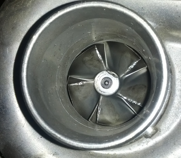 Stuck in the compressor housing, it was very slightly wedged in the fins and came loose soon as I started to spin and prod the wheel.