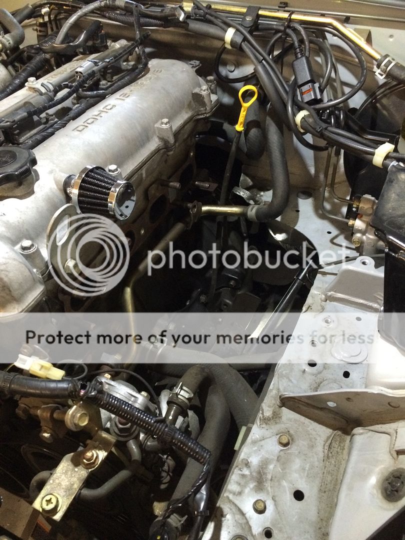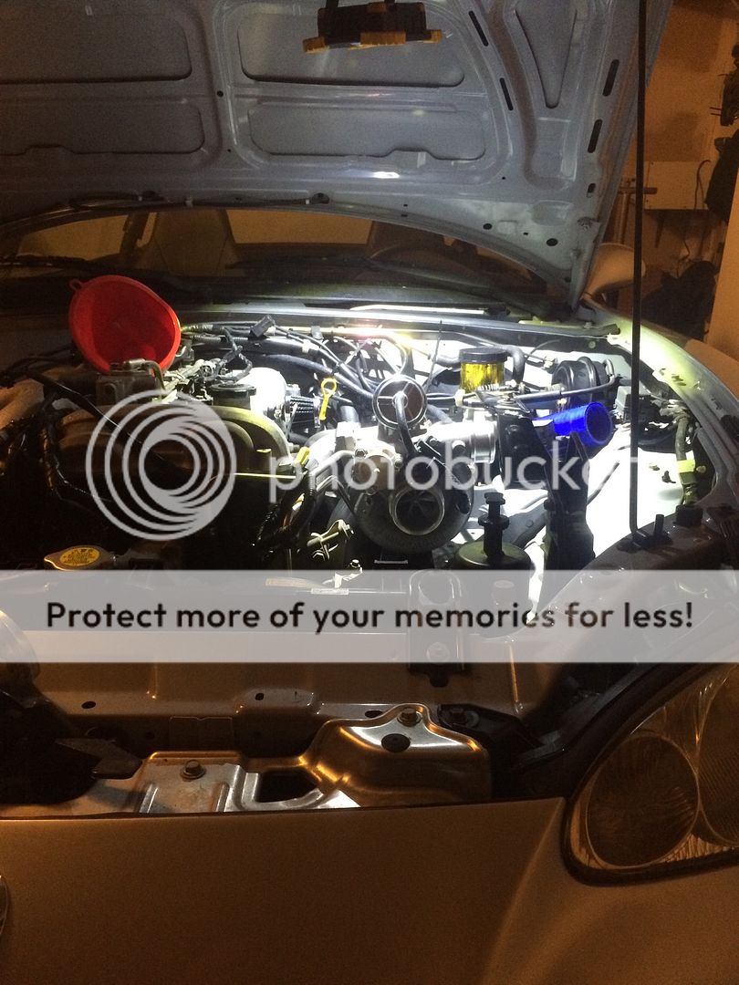 URL=http://s935.photobucket.com/user/enzoloco1/media/image_zps858vjfwx.jpeg.html]http://i935.photobucket.com/albums/a....jpeg~original[/URL] Friday of last week. The turbo install began. Out came the airbox and header heat shield. You can see in the pic I was mocking up the intercooler piping. I need to figure out how to keep it from crushing the upper radiator house. http://i935.photobucket.com/albums/a....jpeg~original Here is a pic showing where I routed the driver's side intercooler piping from the engine bay. http://i935.photobucket.com/albums/a....jpeg~original Out came header and on went valve cover breather http://i935.photobucket.com/albums/a....jpeg~original I managed to unscrew the whole manifold stud while removing the header. The nut was frozen on. http://i935.photobucket.com/albums/a....jpeg~original Oil pan drilled and tapped. Was kinda nervous while doing this. http://i935.photobucket.com/albums/a....jpeg~original I will update with more pics tonight. |