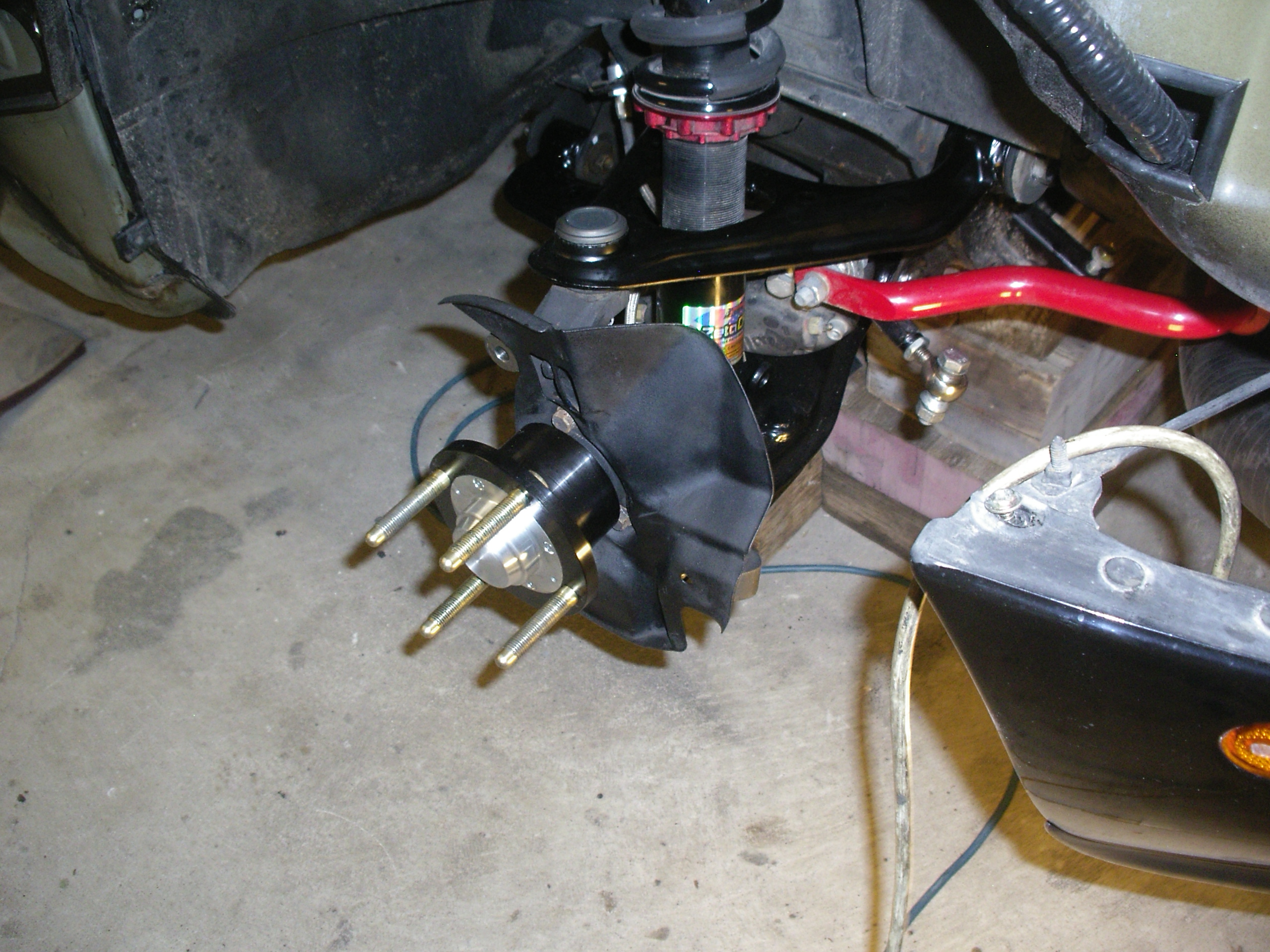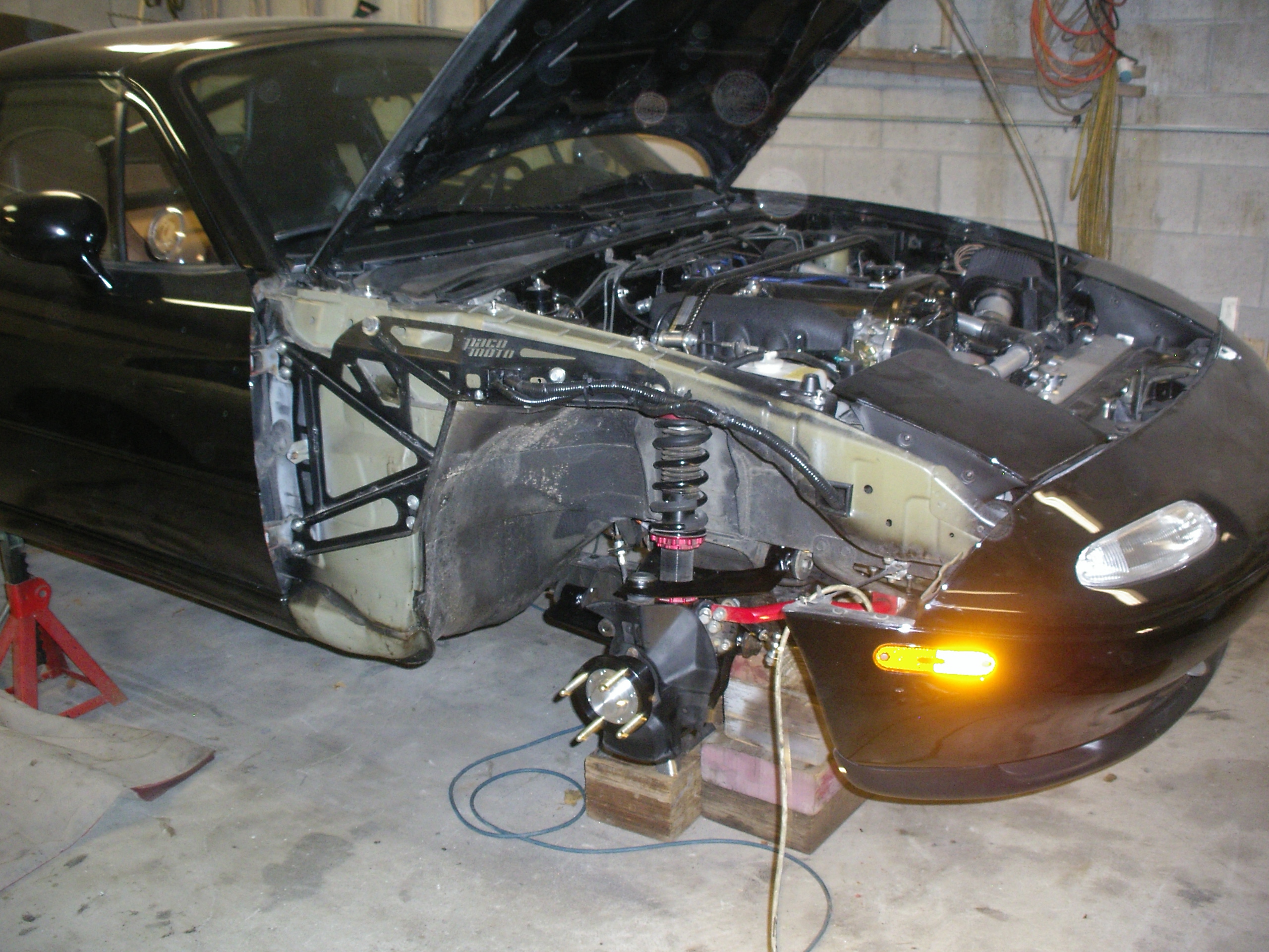 It's been snowing for a couple of weeks, so time to get Blackie up in the air, and swap on the fresh suspension bits. Because it's a street car, I have gone with stock rubber for the bushings, wanting to keep a quiet, hopefully supple feel for the car. The steering rack had been de-powered by the PO, but the pinion was not welded, so I'v sent that off to a guy in Pa., who tig welds the pinion, while set up on a lathe, so he can keep it true, and un-warped. New Le tie rod ends will go back on, and rack spacers to help with the bump steer. Stock rubber bushings are so damn expensive, I kept searching, and figured out it was cheaper to buy all new A-arms, with bushings and ball joints installed, than just getting the bushings, so other than the rear lower arms, she will have all new suspension. Swapped out the front hubs for a set of the Mazda Sport hubs, which seem not to be the great solution they were hoped for by the track guys, but are beautifully made, and will be fine for my street car. And I got them new, for a great price from a MT member who elected to go with stronger hubs. Also had a chance to get a set of used Paco cowl brace arms (thanks devious!) on MT, so those are now on. Front half of the car is finished, other than the rack install, so I can start in on the rear.