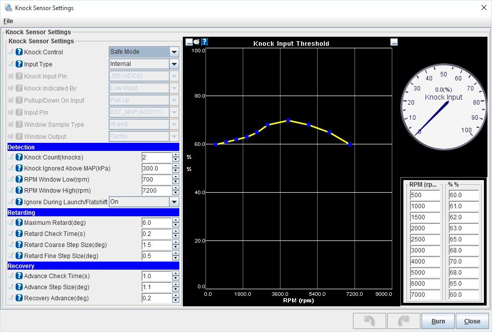 Now I can read the plugs and see they're clean, and coorelate no-knock to what the knock sensor says, then adjust the band up about 10-15%. That way if it says knock, it is in fact knock.