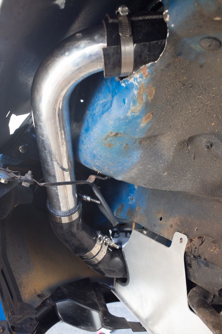 Routed the piping through the fender area, this clears up space near where the A/C compressor will be remounted. For now, I just let the air filter sit downward versus in front of the radiator. Hopefully this helps facilitate some better airflow through the hood vents. I also got the fancy aluminum undertray. Trimmed a bit for my intercooler. Passengerside is a lot more complicated because of the piping is jacked. Hopefully I'll get that side on soon.
