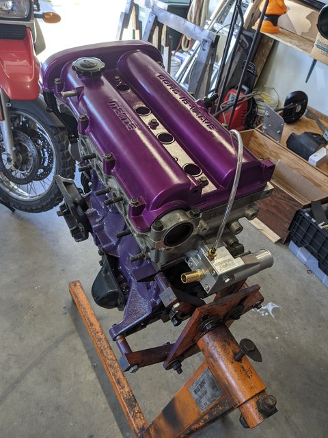 Got this in ahead of time and capped off for the turbo, even though I was running NA at first on the build. PSA though, this is TOO HIGH. Go lower. My AC bracket had to take a lot of trimming to keep it. And I'm a sweaty boy so I had to keep it.