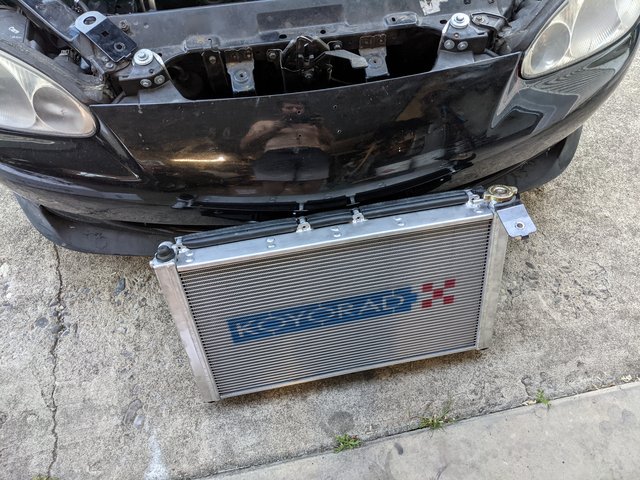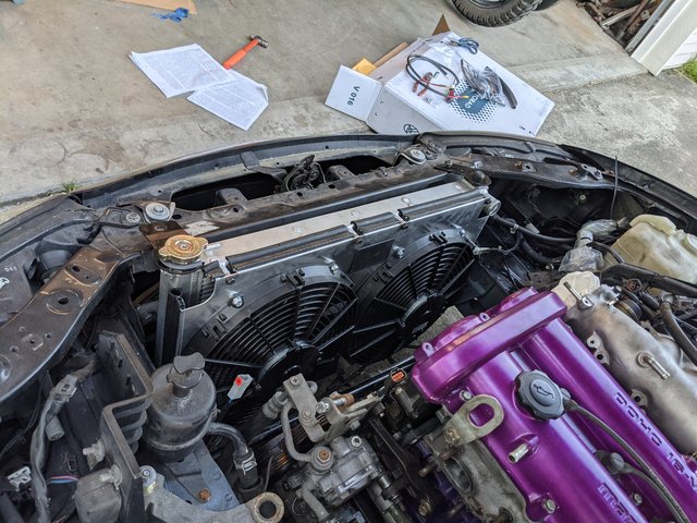 I decided to go with the Flying Miata radiator and "Stage 1" Fan kit because I was too lazy to make my own setup.