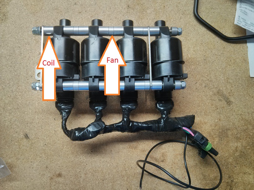 Yep. It's FM's LS coils bracket. For the LS3 coils they should all fit inside the side plates. These are LS2, to my knowledge (got sold the wrong thing), and are too wide to fit. Notice they are round. I used some stainless all thread to make two new rods. Then I had them send me the spacers for their big radiator fan panel. The big spacers on the rod are from the coil kit. The little ones are crossflow fan bracket spacers.
