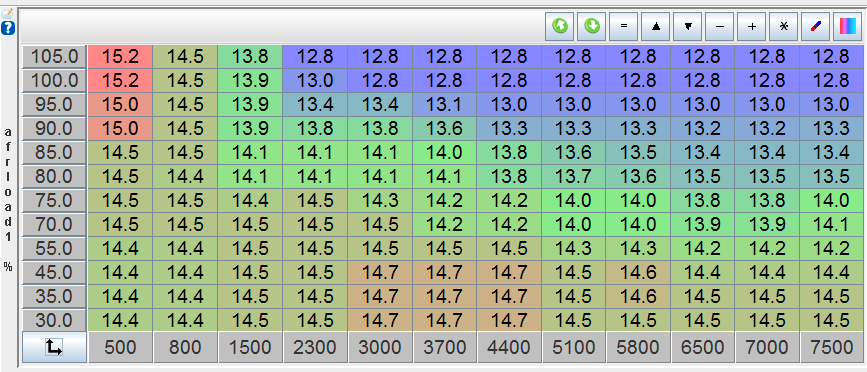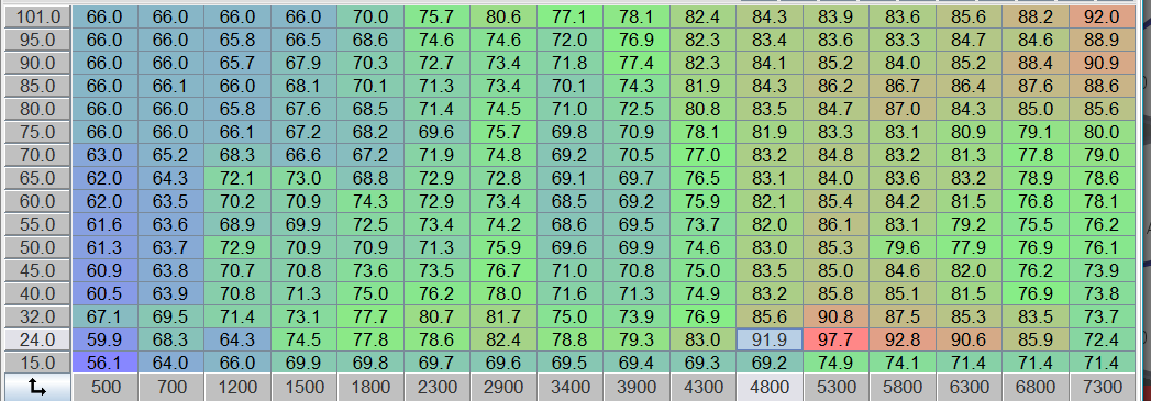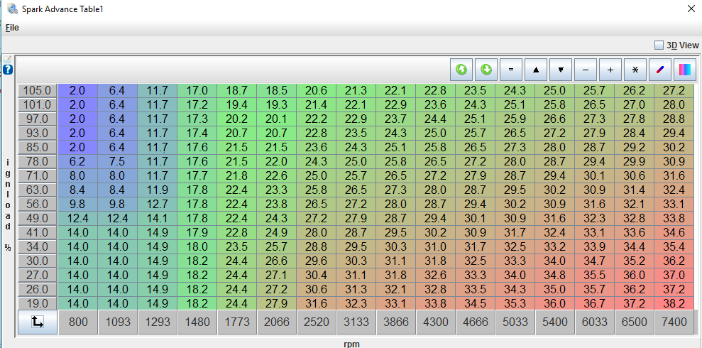 I think I got the log from the tablet attached if anyone minds looking at it. Also here is the spark map if anyone is curious. I was hoping to let VEAL bang out the basic map now. Smooth some manually. Aadjust the AFR map once I can get Virtual Dyno figured out. I swear software hate me, or I have the dumb. Virtual Dyno seems like it would let me make AFR changes, see a difference on the curve (good or bad), adjust for power, then with DetCans play with spark, then go back to AFR, double tap and repeat as necessary.
