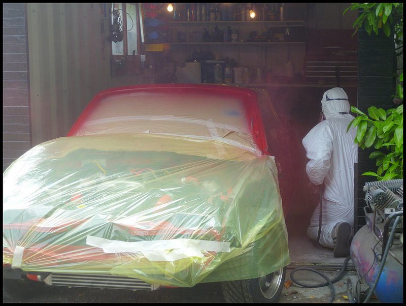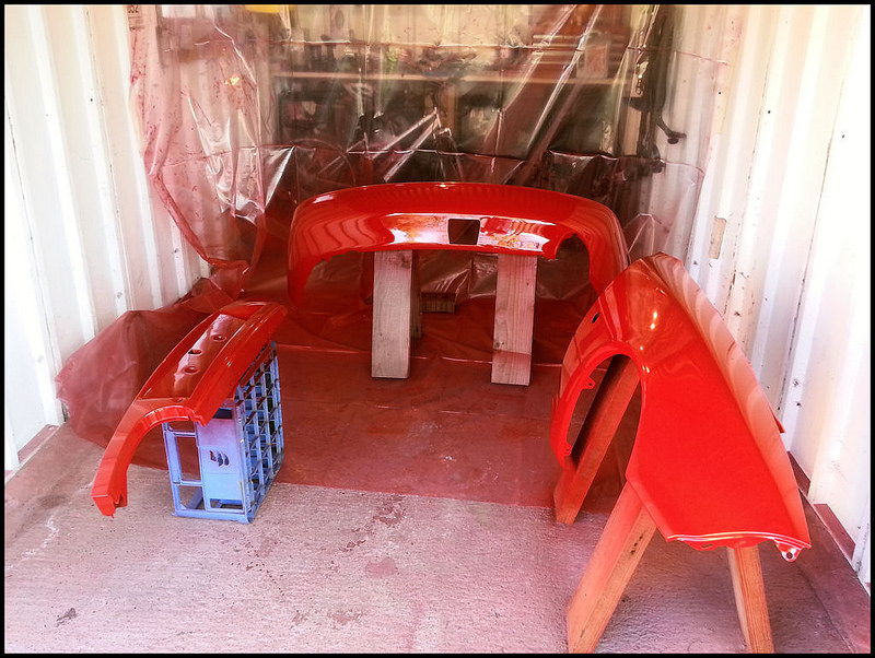 We actually intended to paint mainly in the garage or under the tent, but in practice we found the best results and LESS stuff got in the paint if we did it in the open air. A couple of parts got bugs in but the beauty of DIY was it cost nothing more than time to rub down and try again. We used a fast dry hardener similar to what a smart repair / Dent wizard type guy would use which again minimized the wet paints exposure!