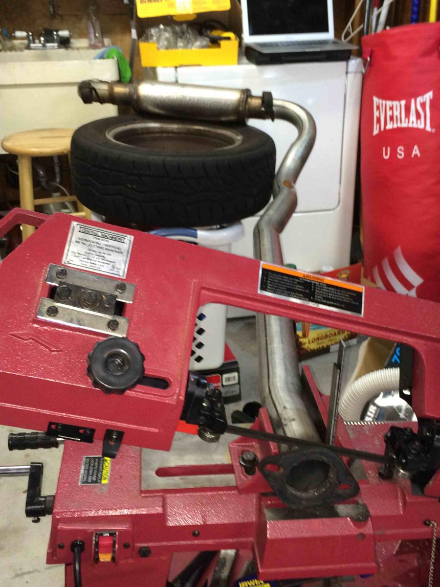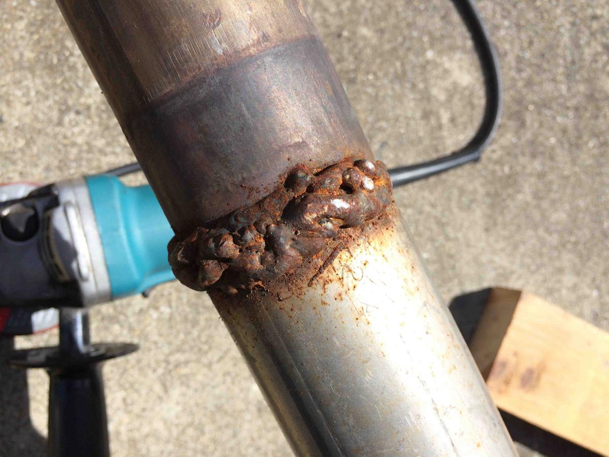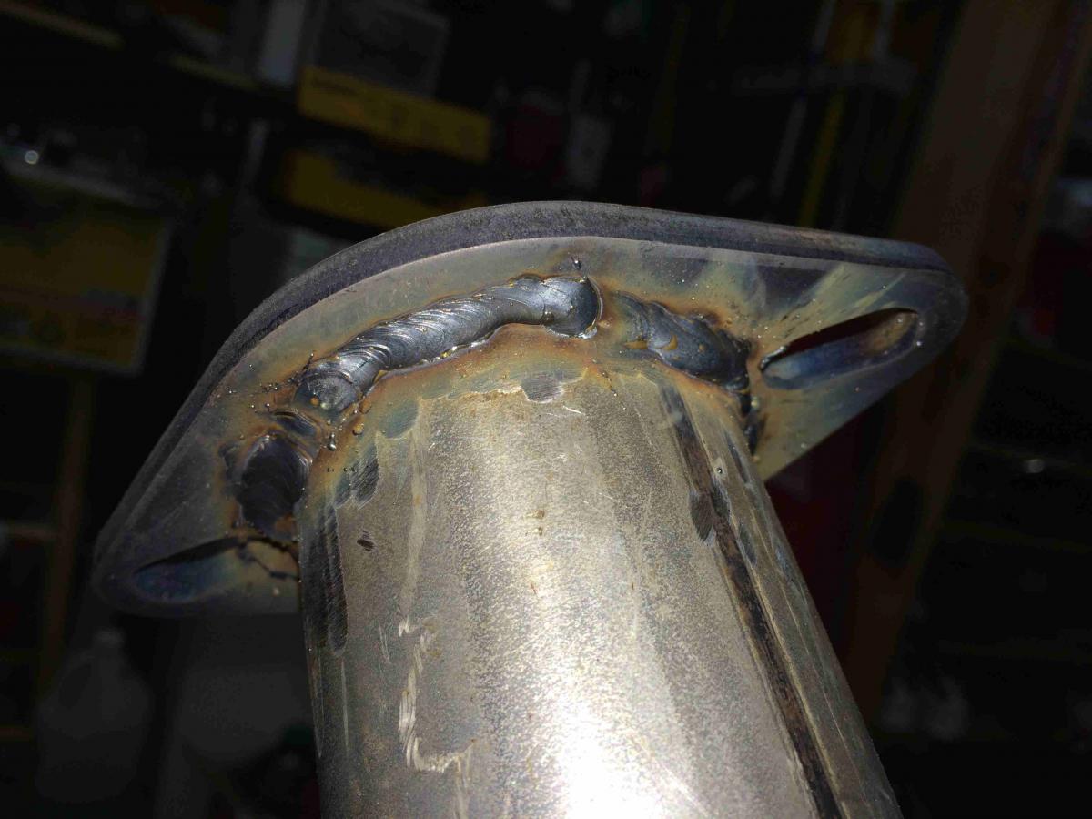 Here's some juicy welds that came with the downpipe to muffler. It was all one piece with these herculean welds. Couldn't imagine putting in a one piece exhaust since I'm not a muffler shop and not easily maintainable. So some flanges were in order...