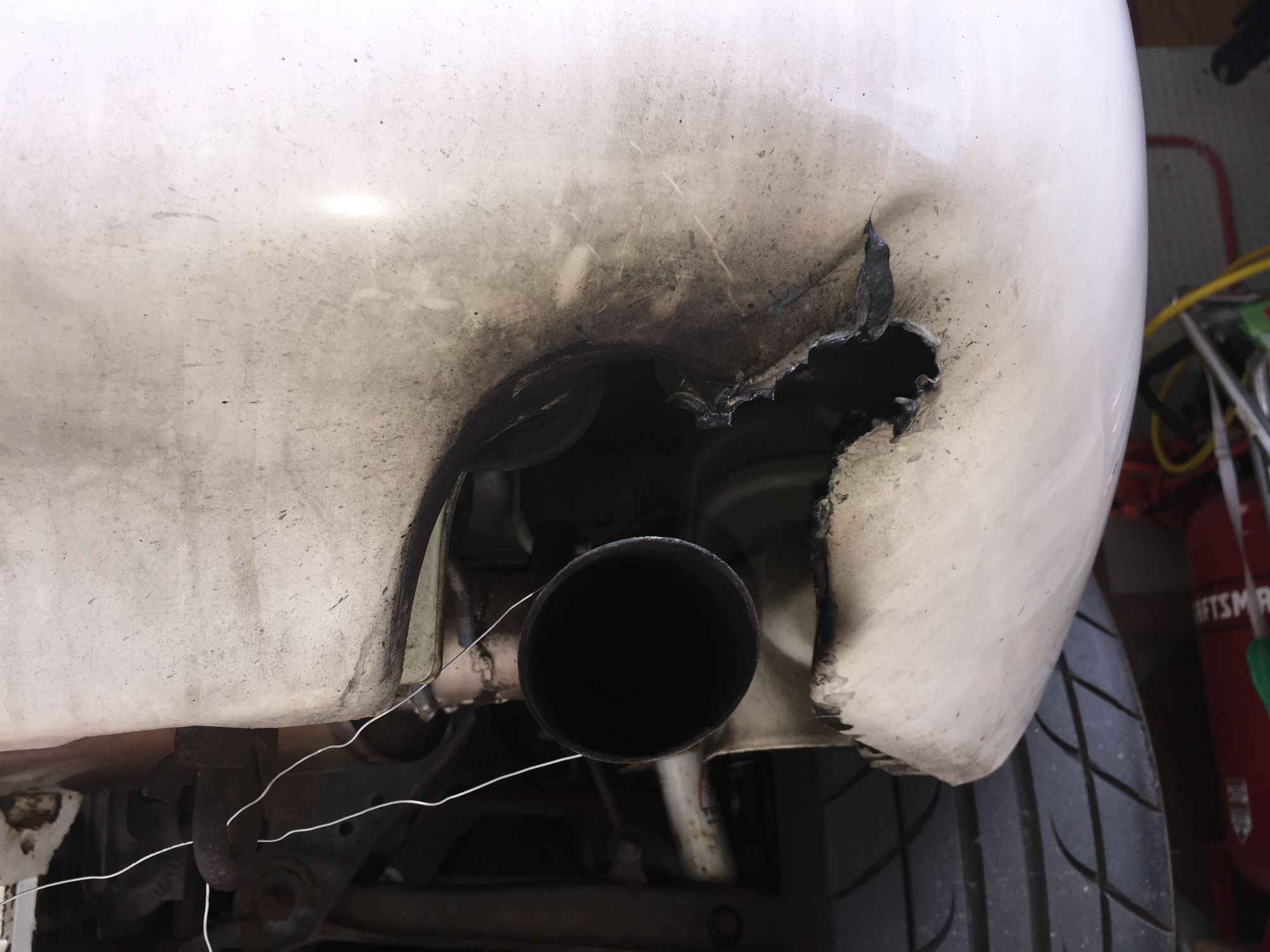 So found out exhaust was rubbing 1/2 shaft axles after track day. Did some welding and re-routing of the piping, but it was sadly out of alignment at the exhaust cutout. I ended up melting the area pretty badly.