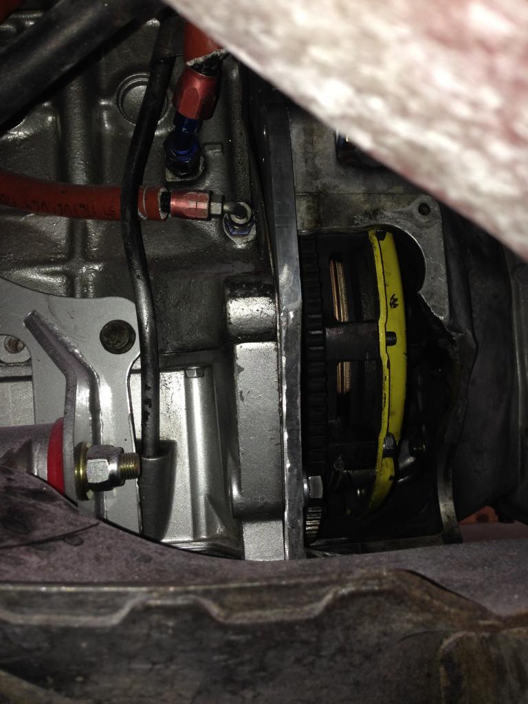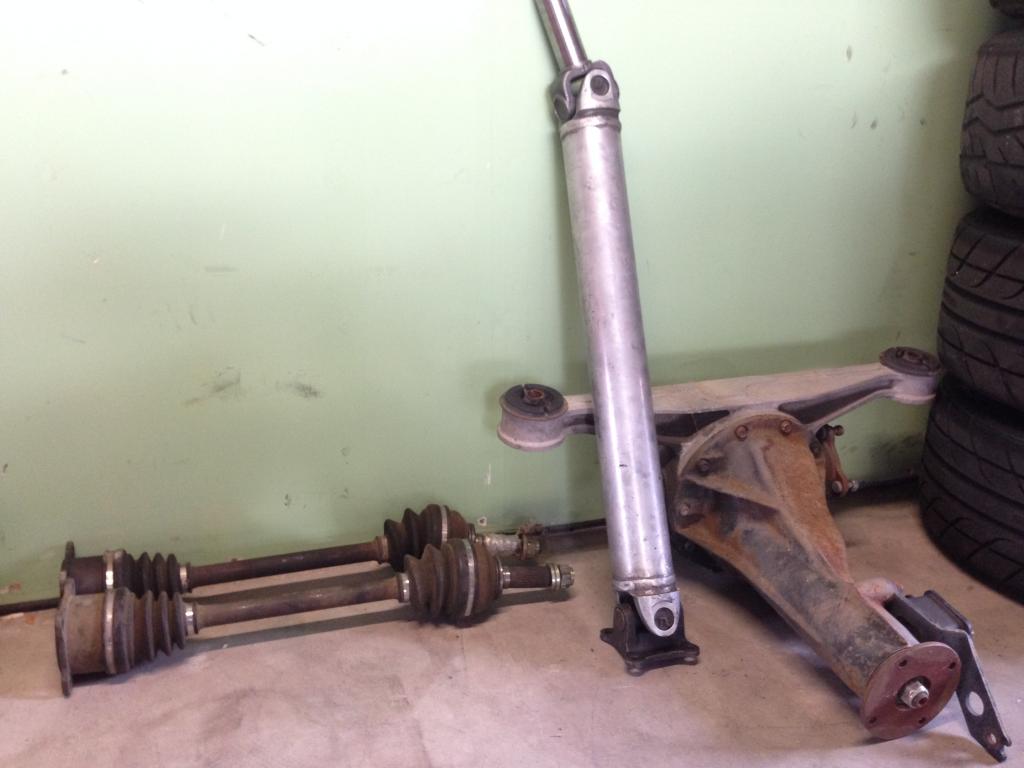 I had Pat's RX-7 TII trans to Miata motor adapter just laying around and decided to pull the trigger and drop the entire drive-line the day after **** started coming apart. The plan is to run the TII transmission and diff, with a Kaaz 1.5. This really isn't easy to do at all in the Miata, the only nice thing is that the wings for the rear diff bolt into a Miata sub-frame. On top of the adapter plate, rear knuckles were made to adapt the TII axles, the bell-housing needed to be cut to accommodate the starter and for exhaust clearance, and custom mounting pick-ups will need to be made for the rear mount on the trans and the front mount of the diff, due to deleting the PPF in the Miata. Also, I needed to snag an 06+ Miata clutch disc for the correct 23 splines on the TII, as opposed to the 22 spine Miata disc.