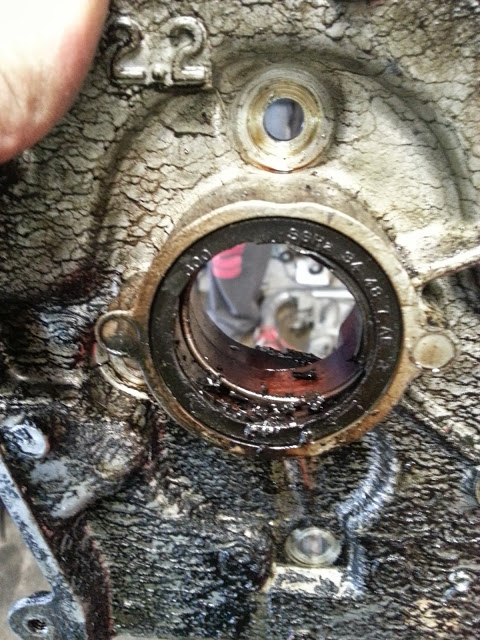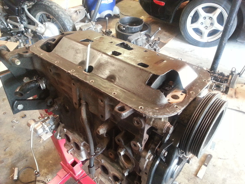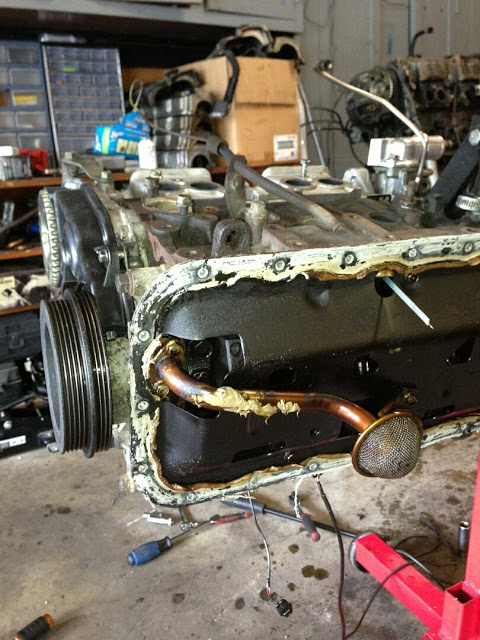 Back to the mess Michael J. Fox made of the oil pan. Yes, that's RTV on the pickup.