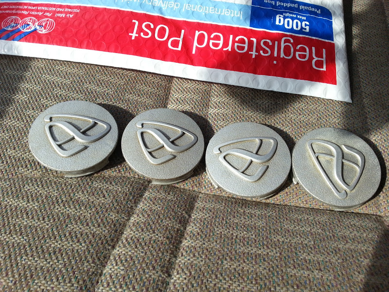Center caps came in. ALL THE WAY FROM AUSTRALIA. I will do my best to mount them upside down in honor of their homeland.