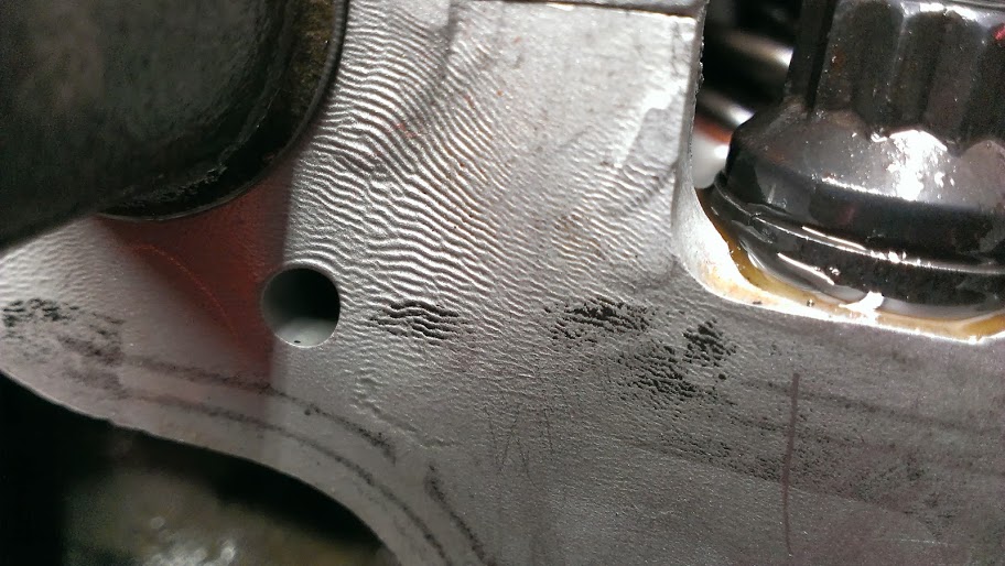 Here we have why OEM gaskets just leak like crazy. The cutouts for the adapter bolts go around the fire ring, so only 50% of the fire ring is contacting, which makes for high spots.