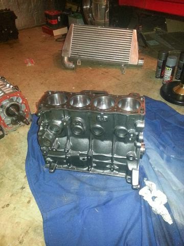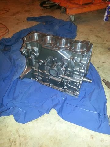 Block clean, bore, cut crank 0.010" and polish, recondition and shot peen rods, press pistons onto rods, and balance whole assembly: $400