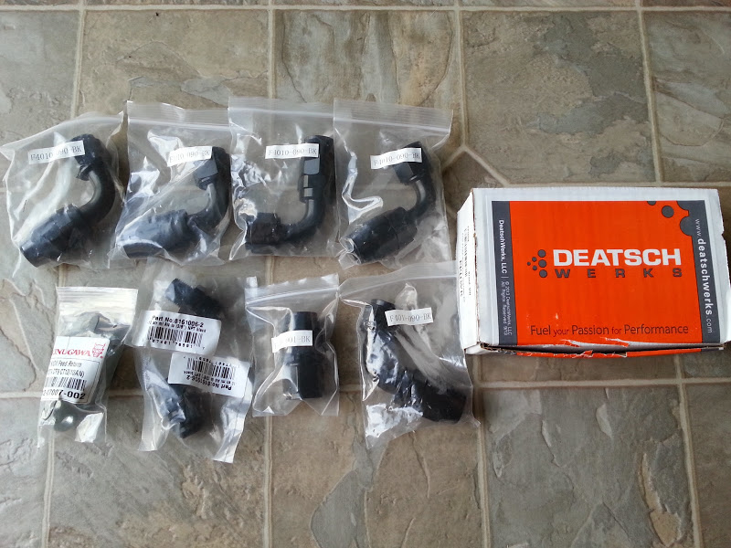 Got sick of wrestling with rubber/generally shitty lines every time i dick with the drain on this. Fixed it. Other fittings for 2x -10AN valve cover vents going on. Also pictured: DW fuel pump wiring kit. (Thanks, FAP9!) Ordered bulkhead plug as well, will run 12awg all the way to pump directly, even in tank.