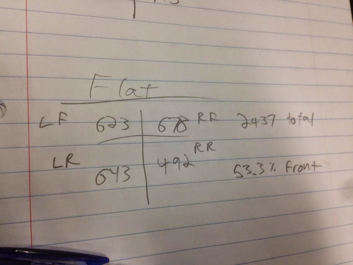 Oh, and there's this. If you're cringing, it's okay, I was too. These are the corner weights with half a tank of gas and myself in the car. What's appalling is the wedge, at >54%. This is the first time I've had the car on corner scales, and what you see is the product of my just kind of eyeballing things and deeming them probably fine for the time being when installing the suspension. Well, now I know why my car oversteers to the right and understeers to the left. Fortunately, this is one of the easiest things in the world to adjust.