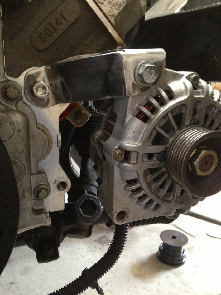 A new alternator bracket was necessary for a couple of reasons. First of all, I replaced the GTO crank pulley with a shorter Corvette/CTS-V/G8 crank pulley for more swaybar clearance. That meant that the alternator needed to be moved closer to the block so that the belt would line up properly. Some people mill down the stock alternator bracket to bring the alternator in further. I chose not to do that since I wanted the alternator so pivot as to serve as a belt tensioner. I removed the stock tensioner and the associated mounting tabs to make clearance for a coolant expansion tank that I bolted to the passenger side head. By making an adjustable alternator bracket, I killed two birds with one stone. All I have to do now for the accessory drive belt is fabricate a mount for an idler pulley so that the water pump is driven. Fortunately, that should be a simple task.