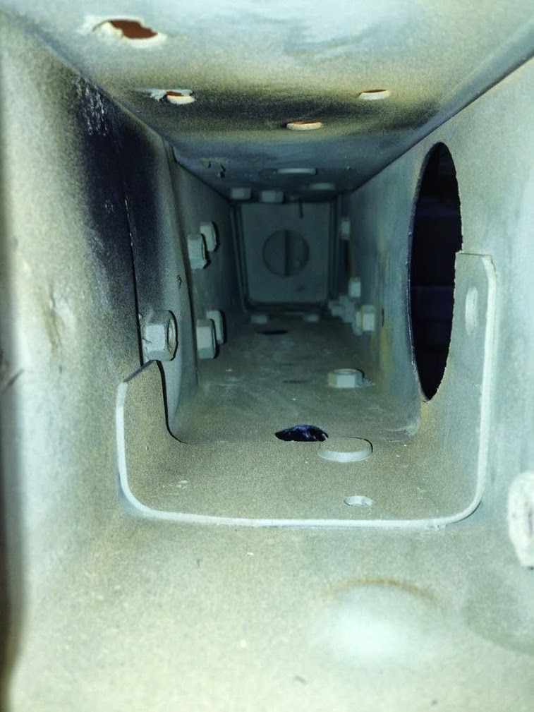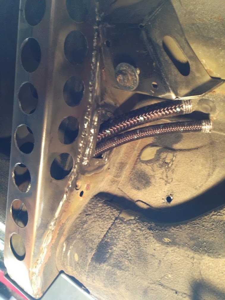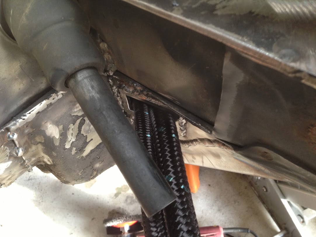 In a previous post, I showed a window in the frame rail, in the engine bay. Fuel and oil lines pass through that hole and come out here, inches from the fuel tank.