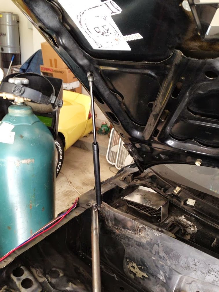The hood is held up with a universal gas strut that I picked up on Amazon. One of them is enough to get the job done and while some companies charge over $100 for hood strut kits, I have about $10 into this setup.