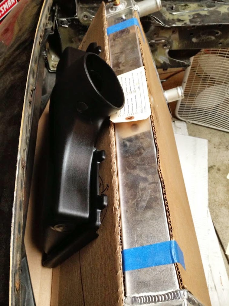 After some CAD(cardboard aided design) work, I determined that a F-body Camaro air intake fits perfectly on top of the radiator ducting. I also picked up a K&N panel filter. The volume that this intake will draw from is a great source of cool, pressurized air.