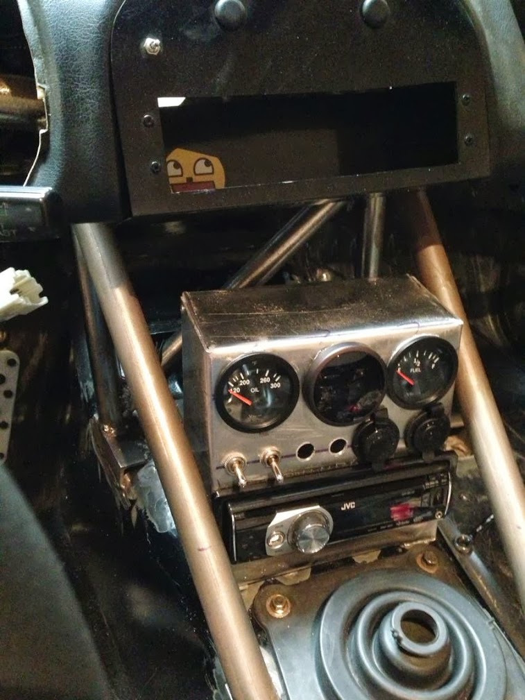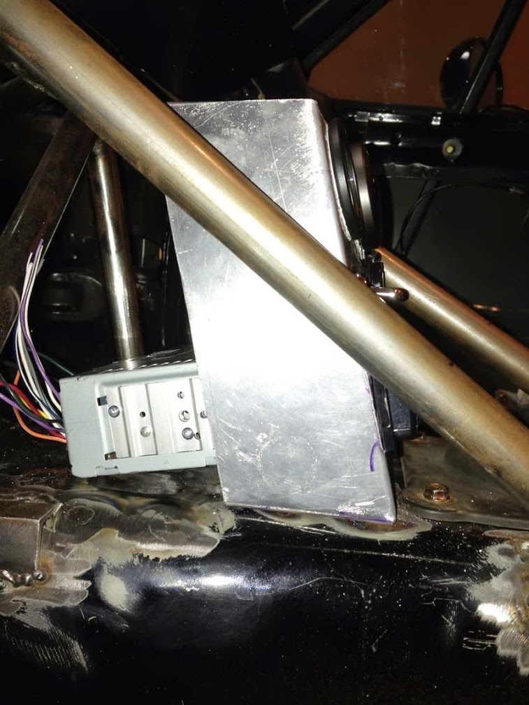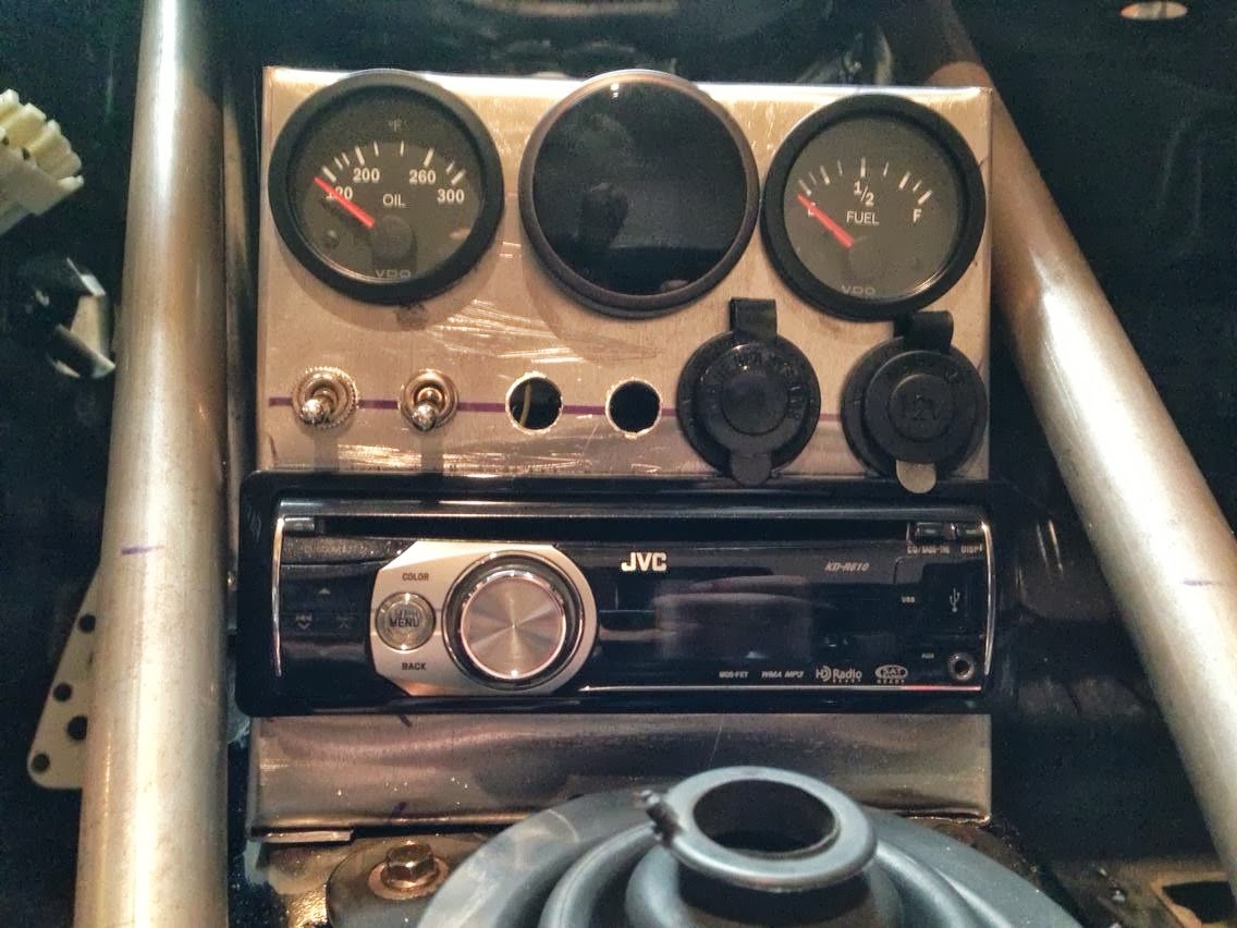 For weight savings, the OEM dash is hacked up and this car is not going to get much of an interior. Accordingly, I needed a utilitarian housing for gauges, switches, power sources, and the radio. Yes, this car is still going to have a radio. Anyway, I used my metal break to make an aluminum structure to handle this task. The structure bolts to the transmission tunnel via nuts that I welded to the inside of the tunnel. This center console is easy to reach and is short enough for my GPS to mount to the top of it without hitting the bottom of the dash.