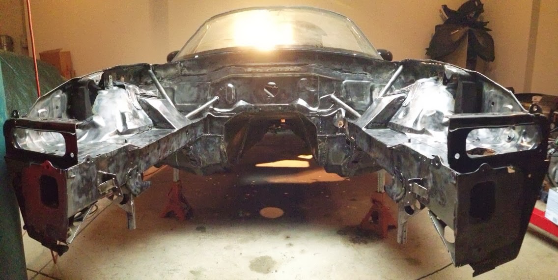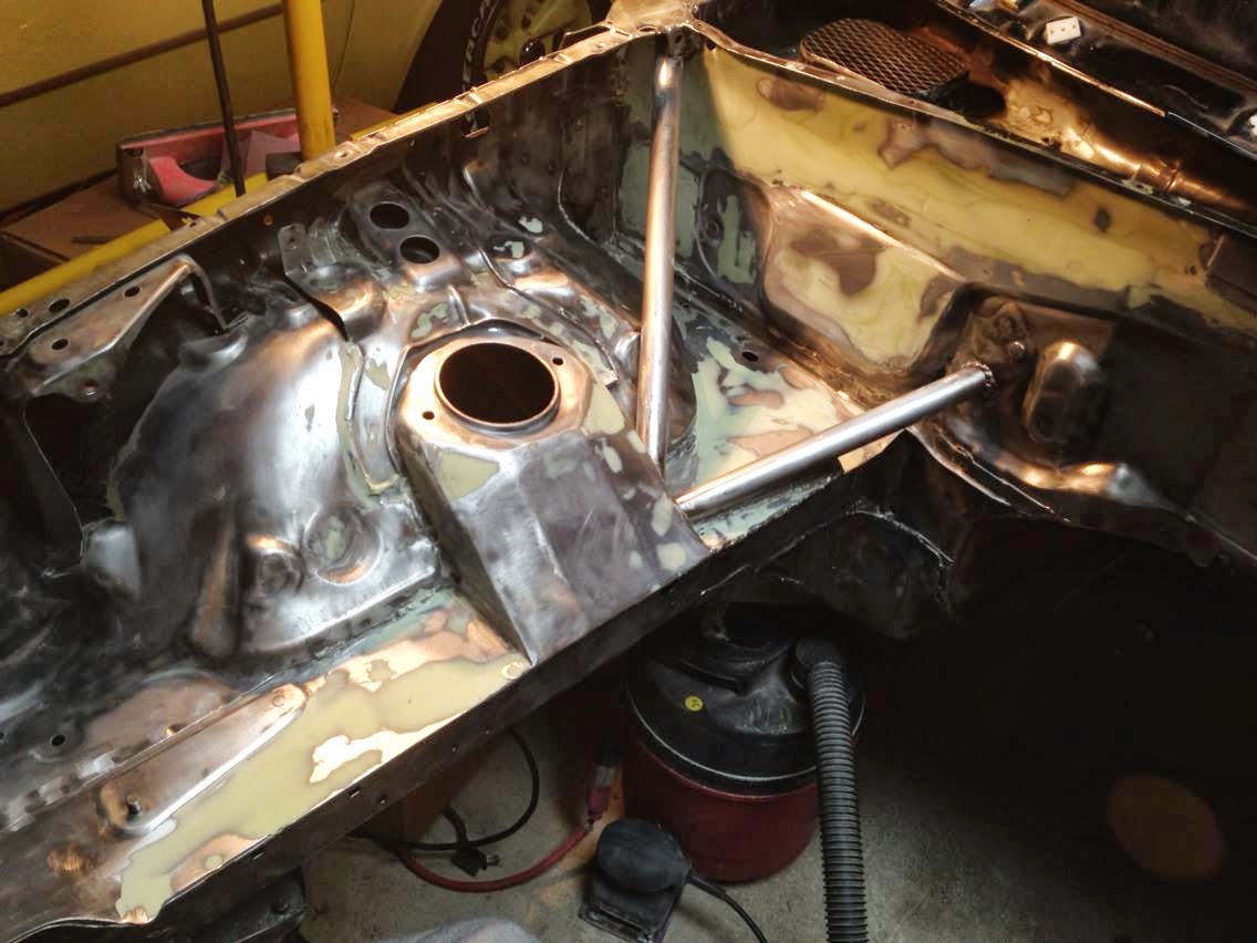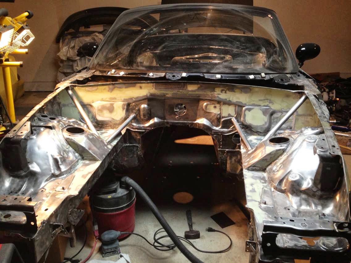 The other big task has been preparing the car for paint. The engine bay, interior, and wheel wells will all need to be painted. Accordingly, the engine bay has been stripped to bare metal, the inner firewall has also been stripped, and the wheel wells have mostly been stripped. The paint work, engine bay included, will most likely take place after the cage is complete.