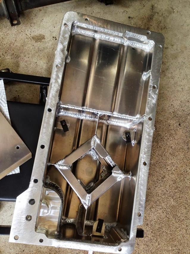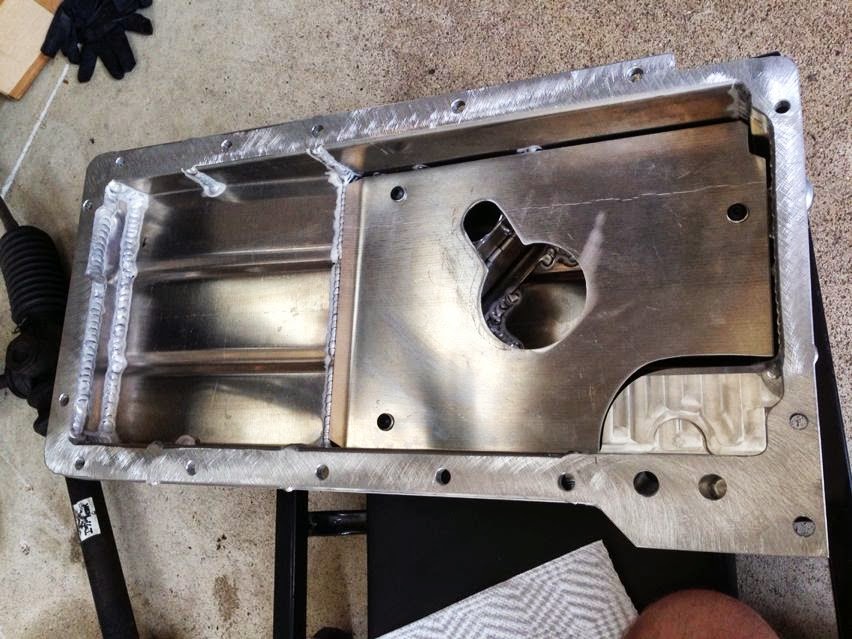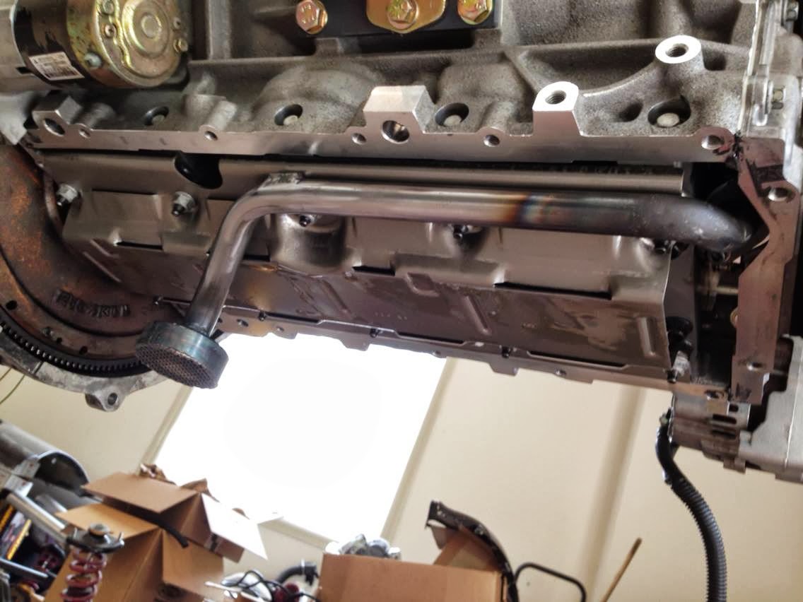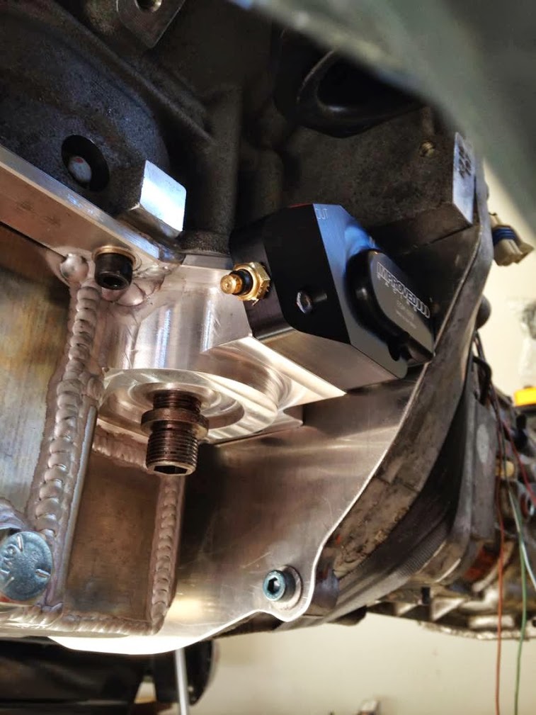 This is the V8Roadsters aluminum oil pan. A rear sump pan is necessary for this swap, and the front of the pan must be shallow enough to clear the steering rack. The V8R pan is made specifically for this swap and meets that criteria. Additionally, the V8R pan is baffled with trap doors to prevent oil starvation--a tremendous plus for car that sees track time. This model has provisions for an oil filter to screw on, which eliminates the need for an external filter and the additional complexity that a remote filter setup adds. This pan comes with an oil pickup tube and has just enough clearance to accommodate an unmodified GTO windage tray.