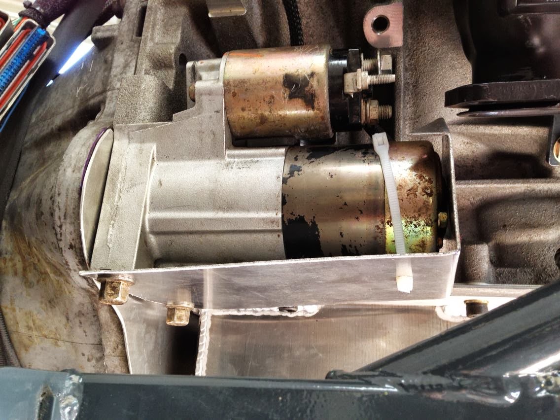 This shield protects the starter from the flange area on the header and from the exhaust pipe that runs beneath.