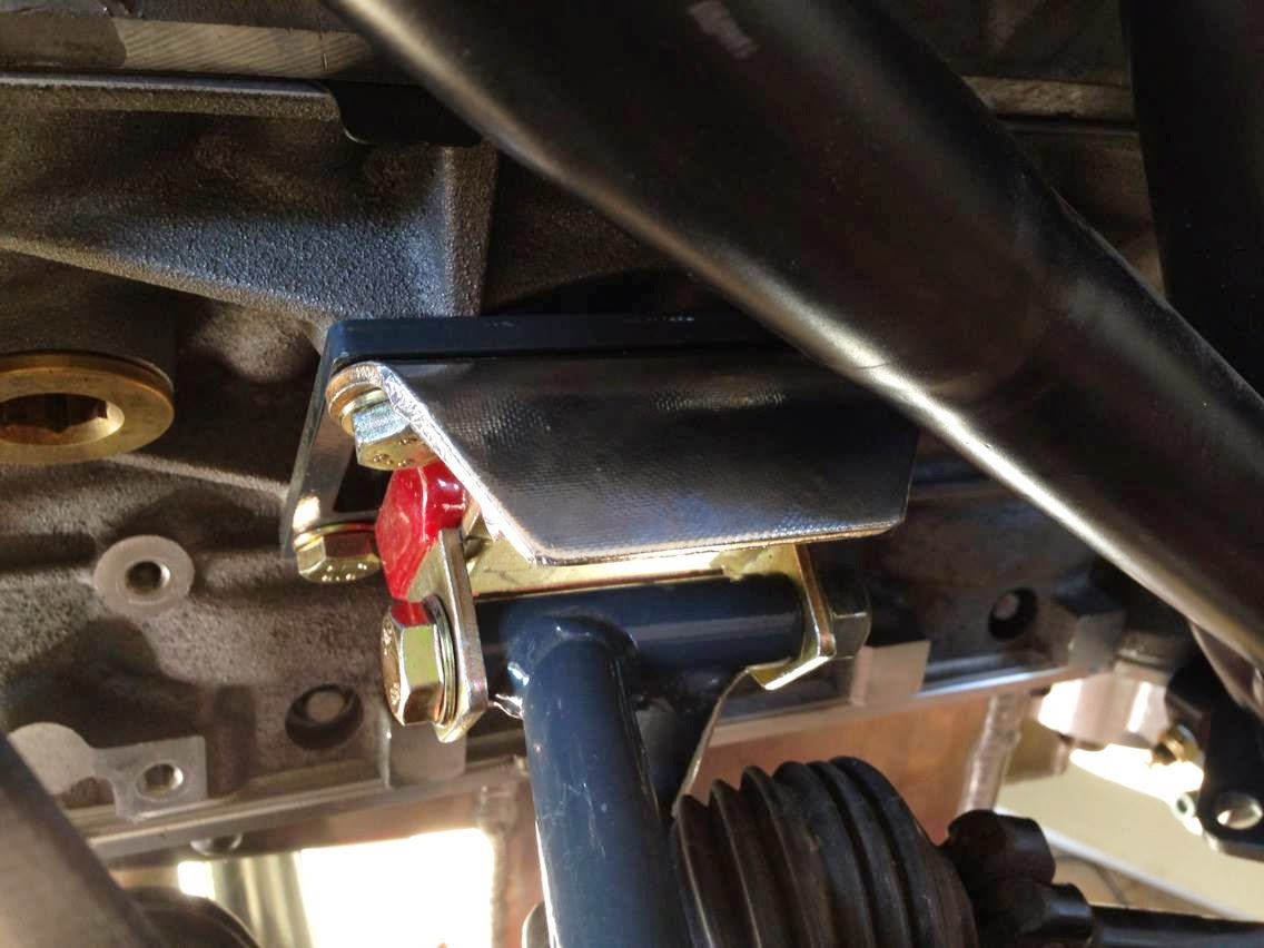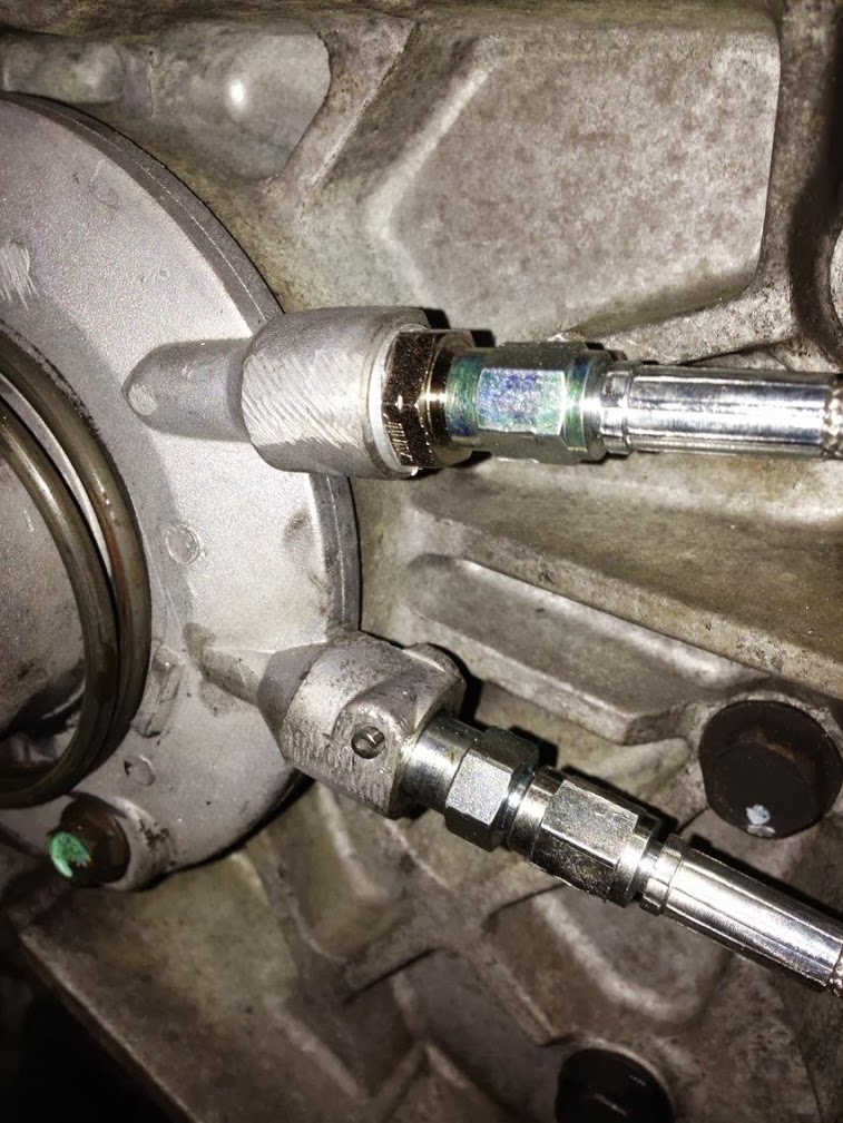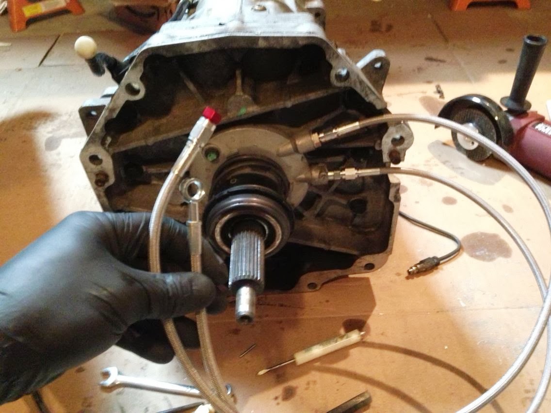 Lines to the clutch slave cylinder needed to be installed. The line on the bottom runs to the clutch master cylinder and the line on top is a remote bleeder, which allows the clutch to be bled with the drivetrain installed in the vehicle.