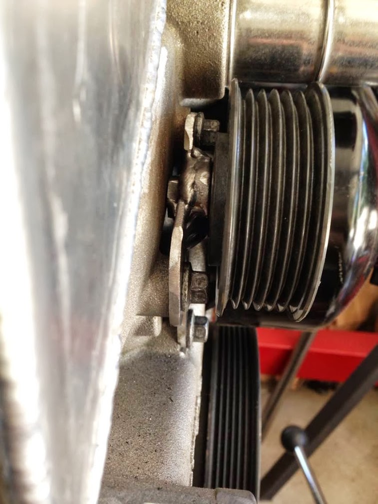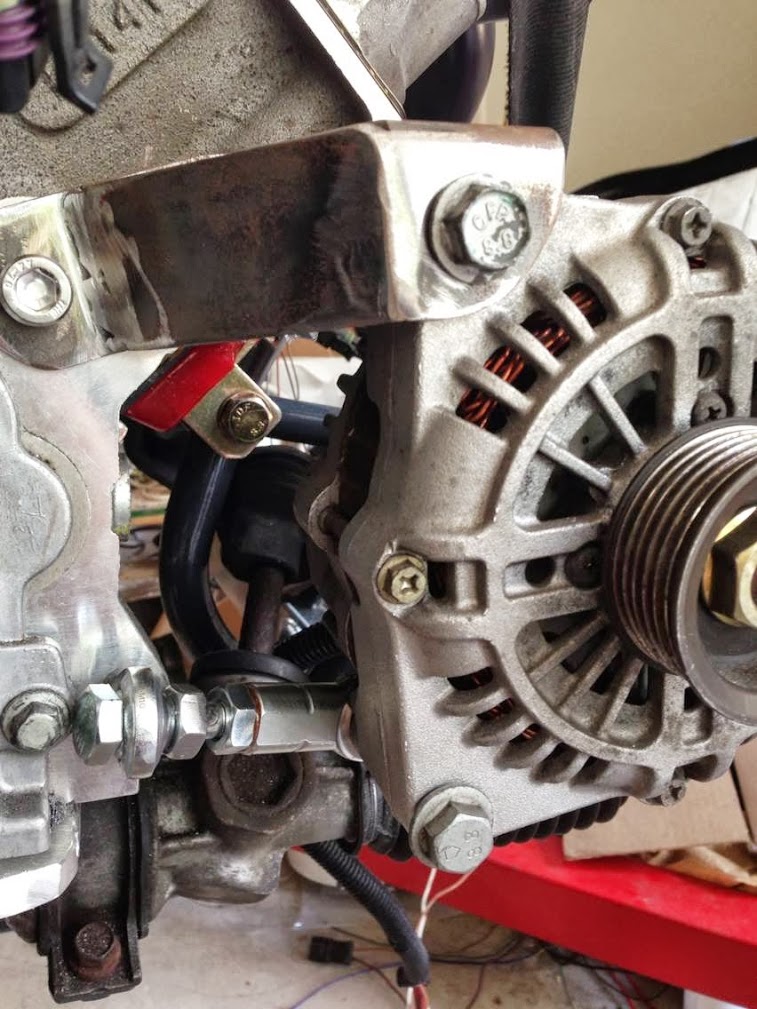 See the lowest hole on the block that's almost in line with the lower hole on the alternator? A turnbuckle will go between those so that the assembly can serve as a belt tensioner. As it so happens, the spacing is perfect for that.