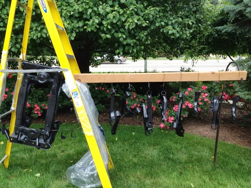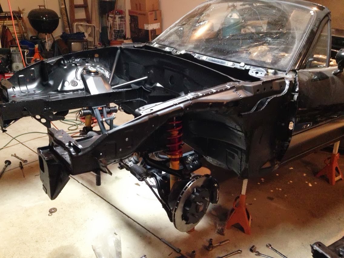 I started pressing in bushings and installing the suspension tonight. I'm taking the wheels and tires in for mounting and balancing tomorrow. On Friday, the car will be rolled onto a trailer and hauled in for a 3/4 cage. Once I get the car back from the fabricator, I hope to have it driving within a couple of weeks. The objective now is to turn the car into a roller for the sake of easier transportation.