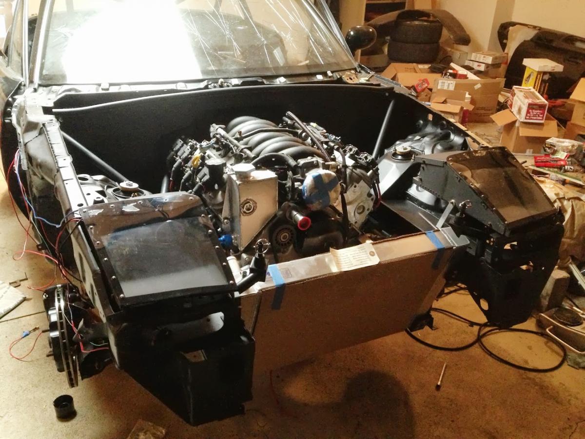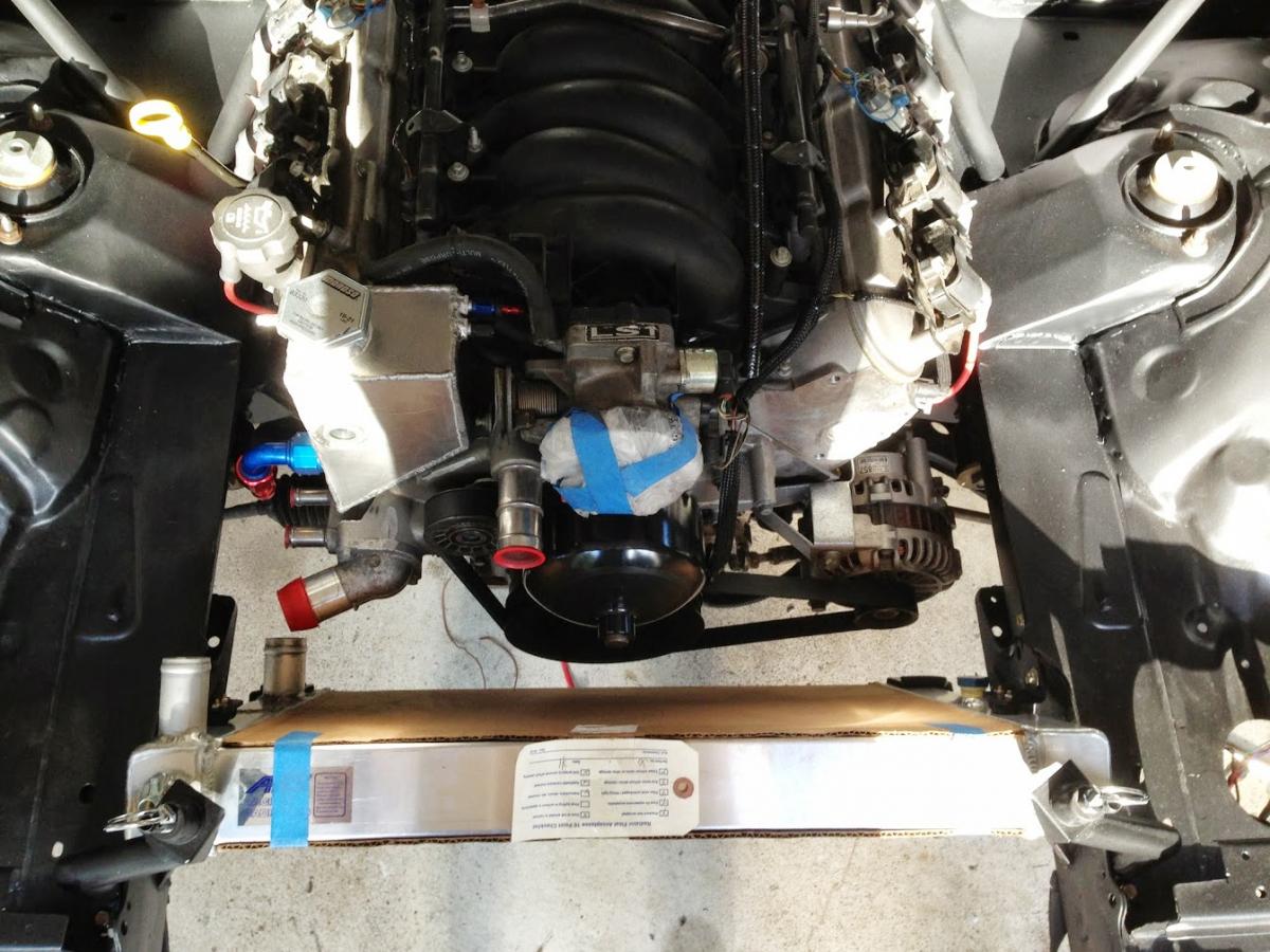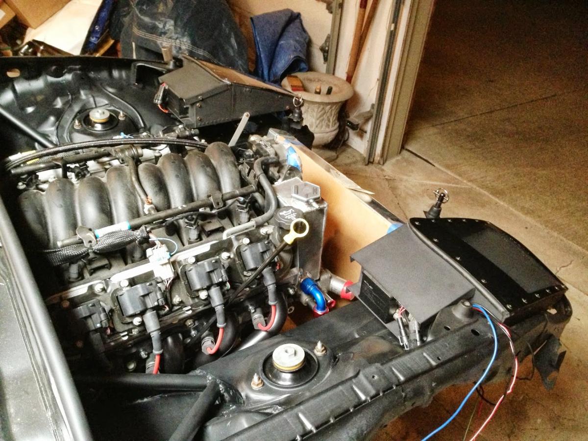 Here's the fully populated engine bay. Yes, the radiator fans are held back with zip ties. I never said the car was truly done.