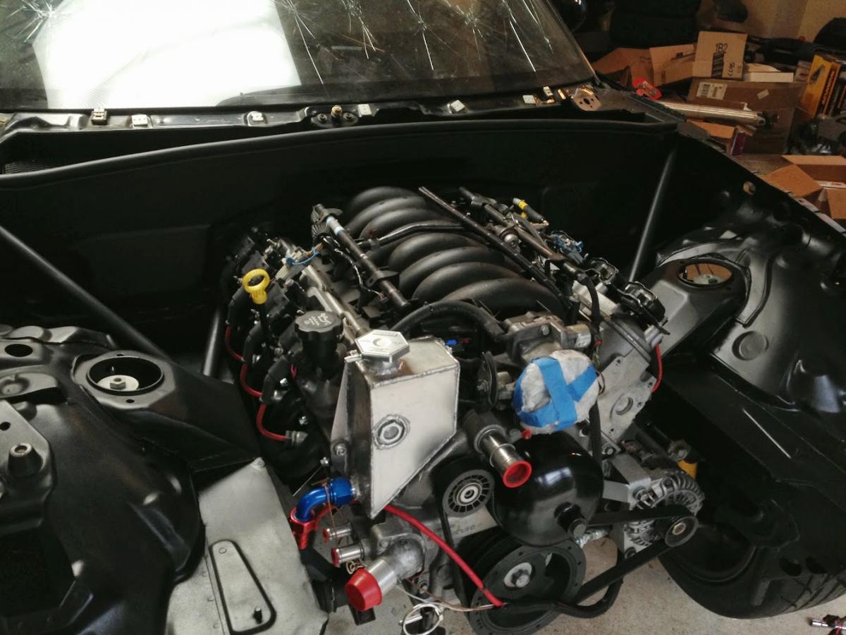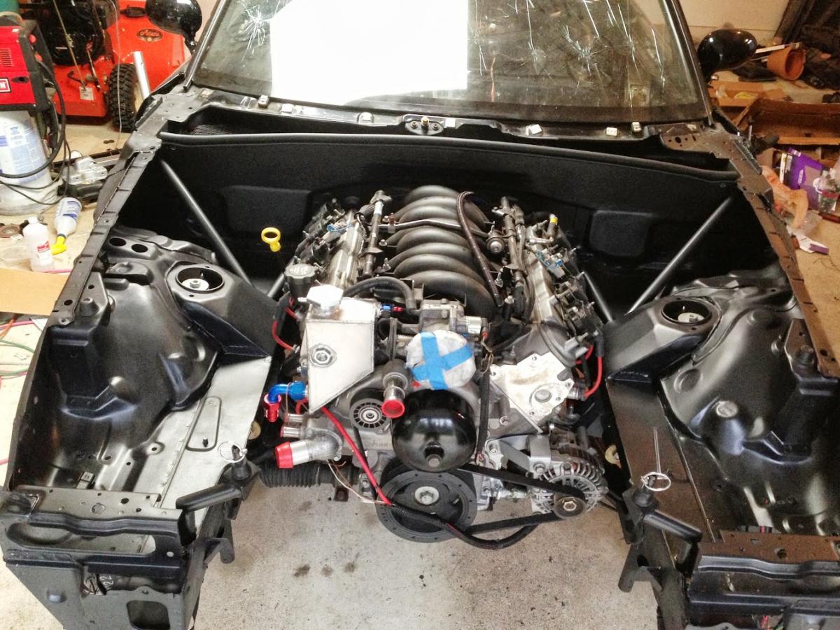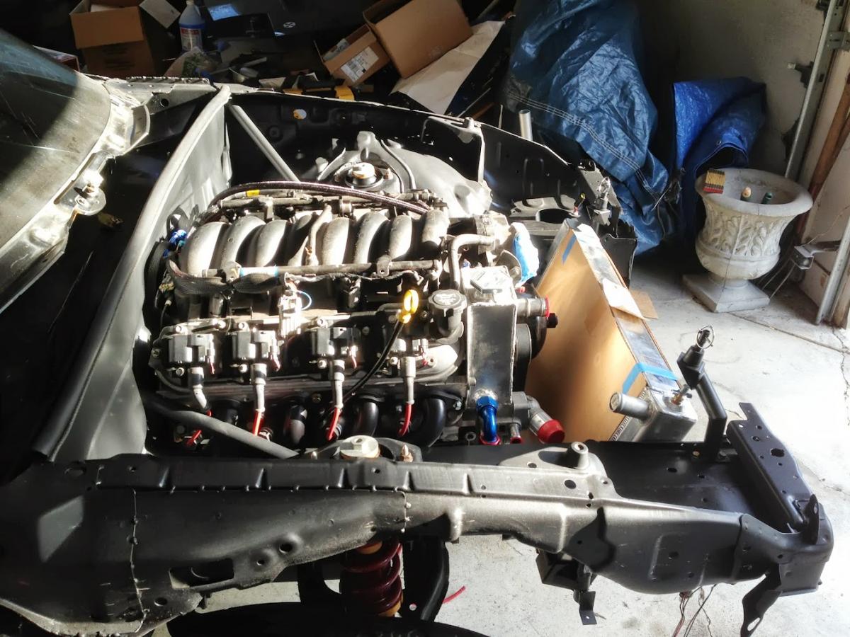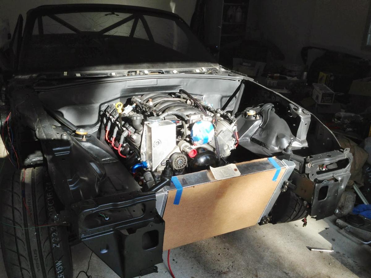 Here's the fully populated engine bay. Yes, the radiator fans are held back with zip ties. I never said the car was truly done.