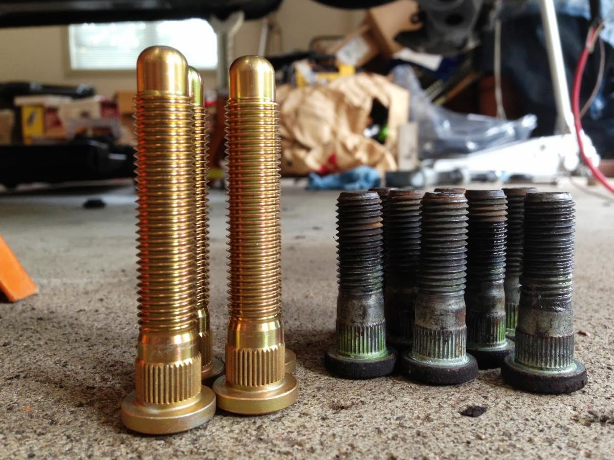I wasn't satisfied with the amount of thread that the lug nuts were able to catch with the stock wheel studs, particularly since I have aluminum lugs. I ordered some ARP extended studs for the front(already had them on the rear), and pressed them in with the Harbor Freight balljoint service tool of glory(HFBJSTOG). They look very long, however the length is perfect. The nuts catch all of the thread and the knurled bit sticks out a tad.