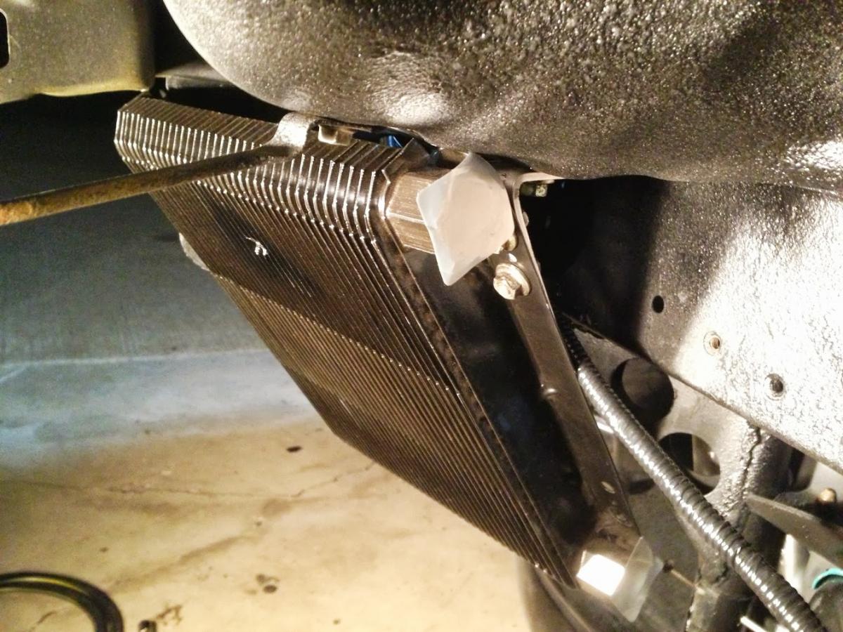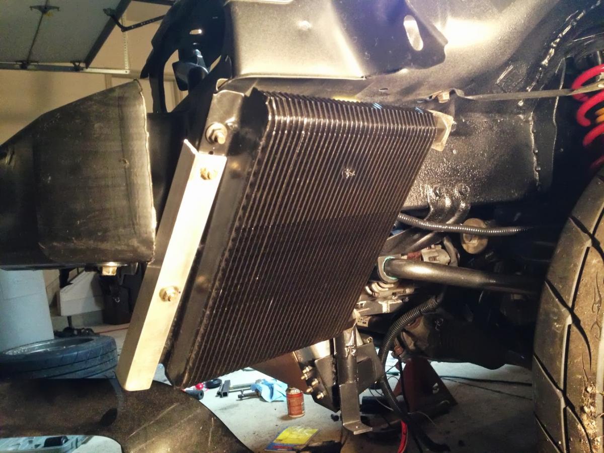 The oil cooler is mounted in what should be its final location. I initially had it on the passenger side but opted to move it to the drivers side so less hose will be required. The piece of aluminum angle is there to protect the exchanger. The corner of the exchanger sits pretty close to the bumper skin, making it vulnerable in small impacts. Now, with protection, I should be able to slam cones and graze tire walls allll dayy!